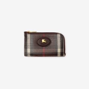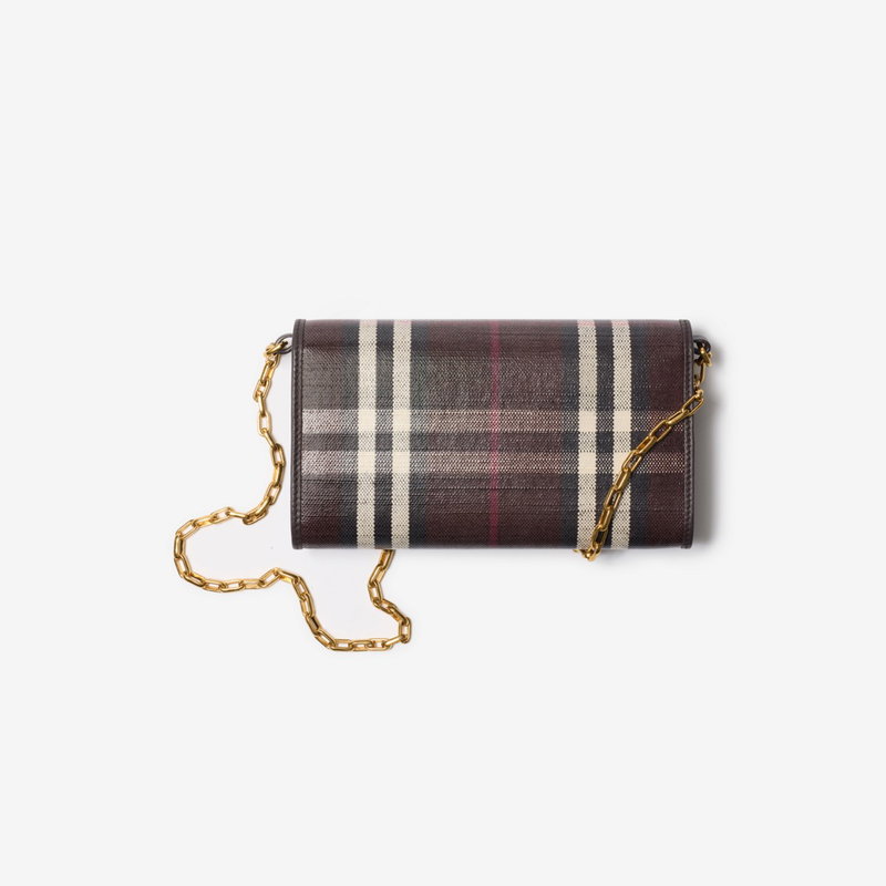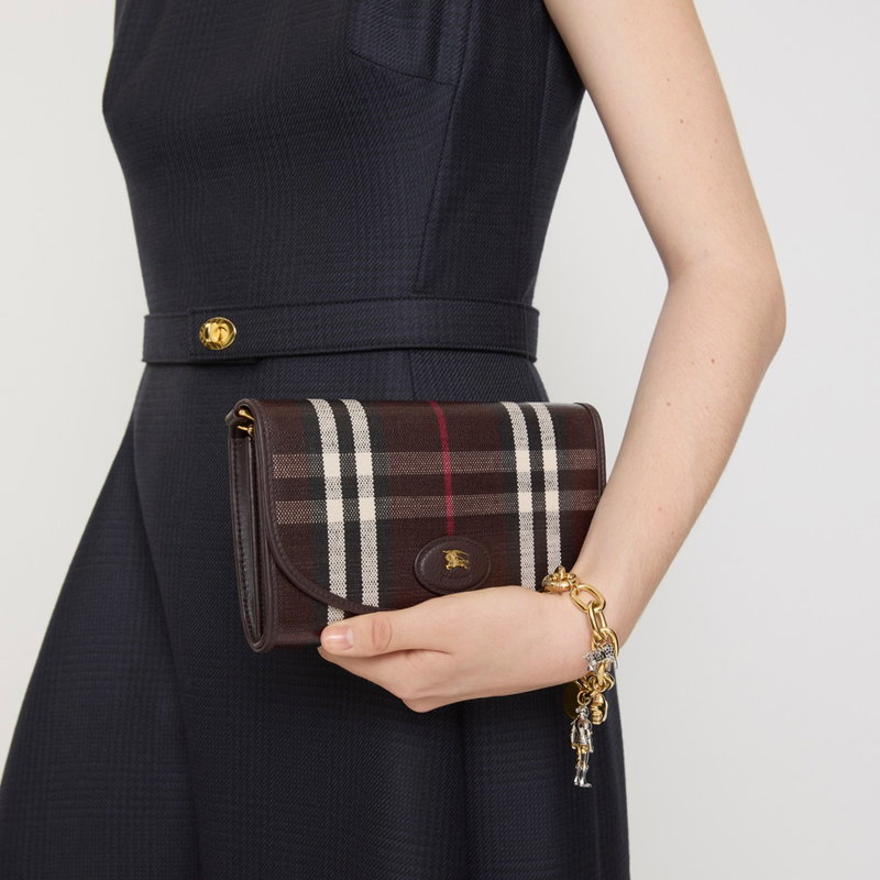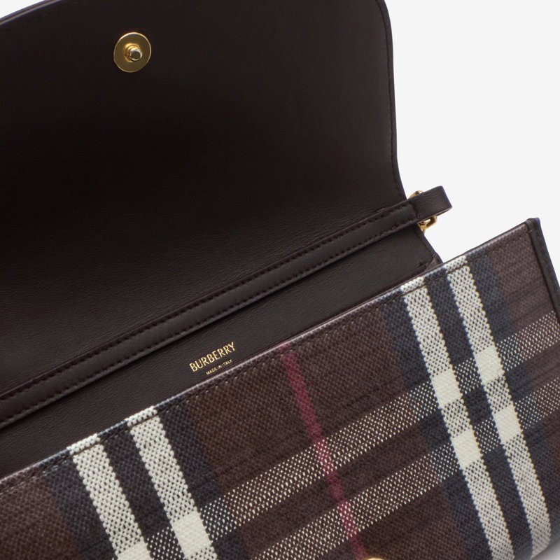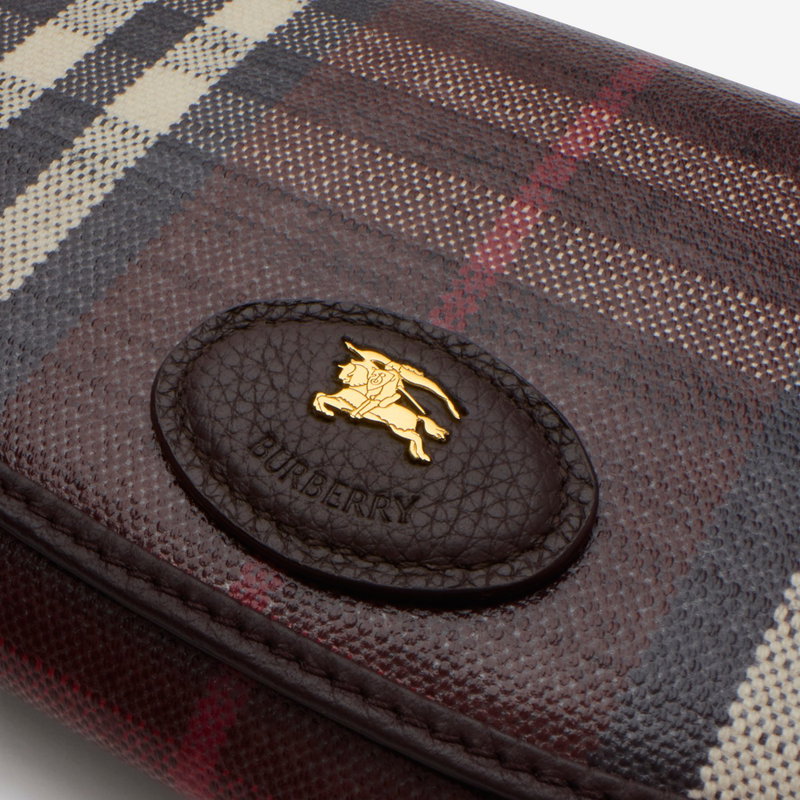 A wallet made from a cotton linen blend trimmed with smooth calf leather. The fabric is jacquard-woven with the Burberry Check and has a coated finish inspired by rainwear and the outdoors. The design is detailed with our Knight stamp, an archival motif first seen on Burberry bags in the 1980s. Carry as a mini bag using the chain crossbody strap. Chain and leather strap Foldover flap with press-stud closure 12 card slots Zip coin compartment Five slip pockets Hand-painted edges Brushed metal hardware Leather patch with Equestrian Knight Design at front Comes with a dust bag