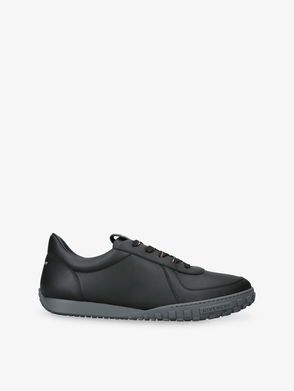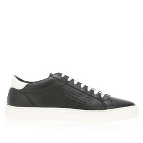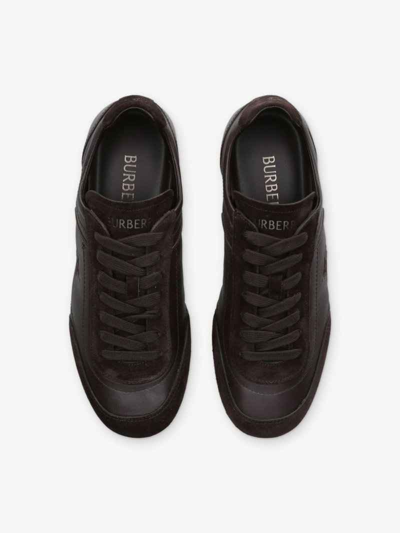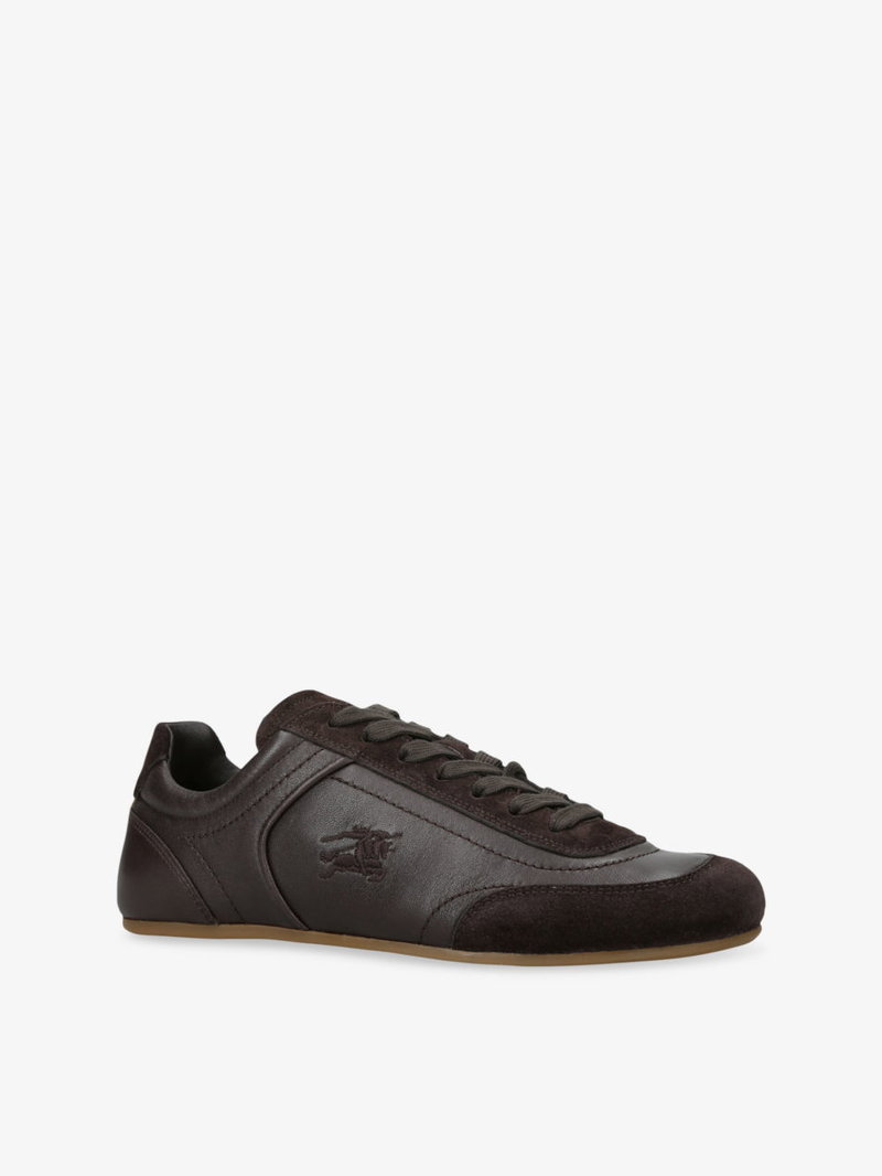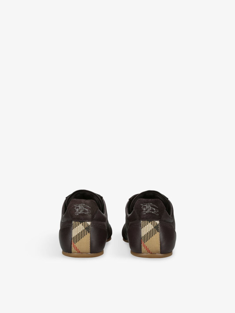Burberry leather trainers. Lace-up fastening. Round toe, panelled upper, logo detailing, Burberry Check webbing at back.