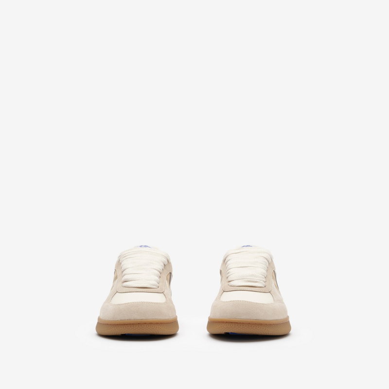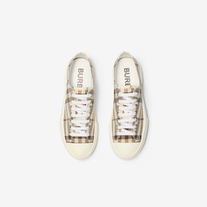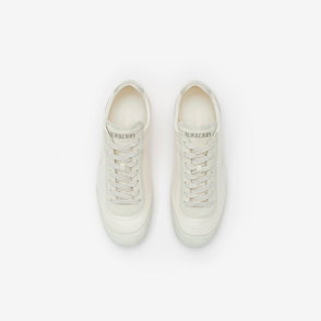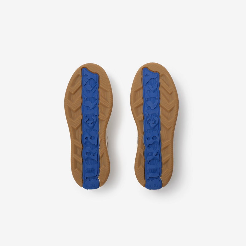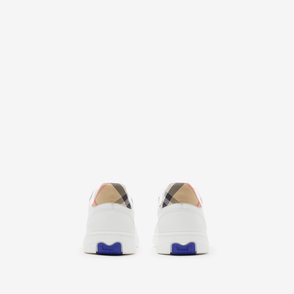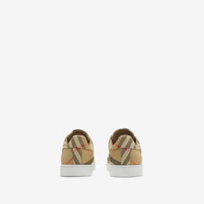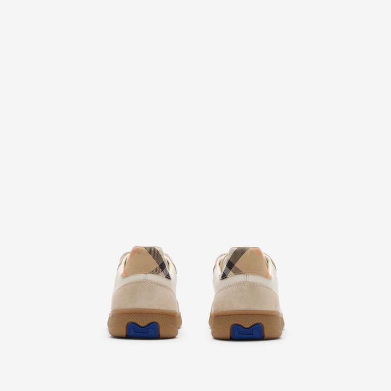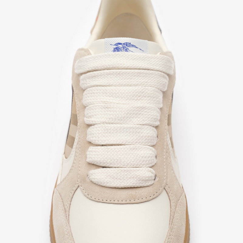 Italian-made sneakers in smooth calf leather and suede, with a contrasting cuff and side panel woven with the Burberry Check in our signature sand colourway. The style features an Equestrian Knight Design label and the soles are moulded with archive Burberry lettering.