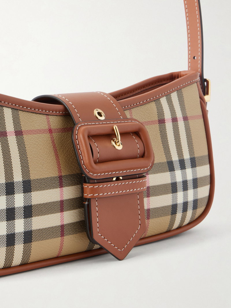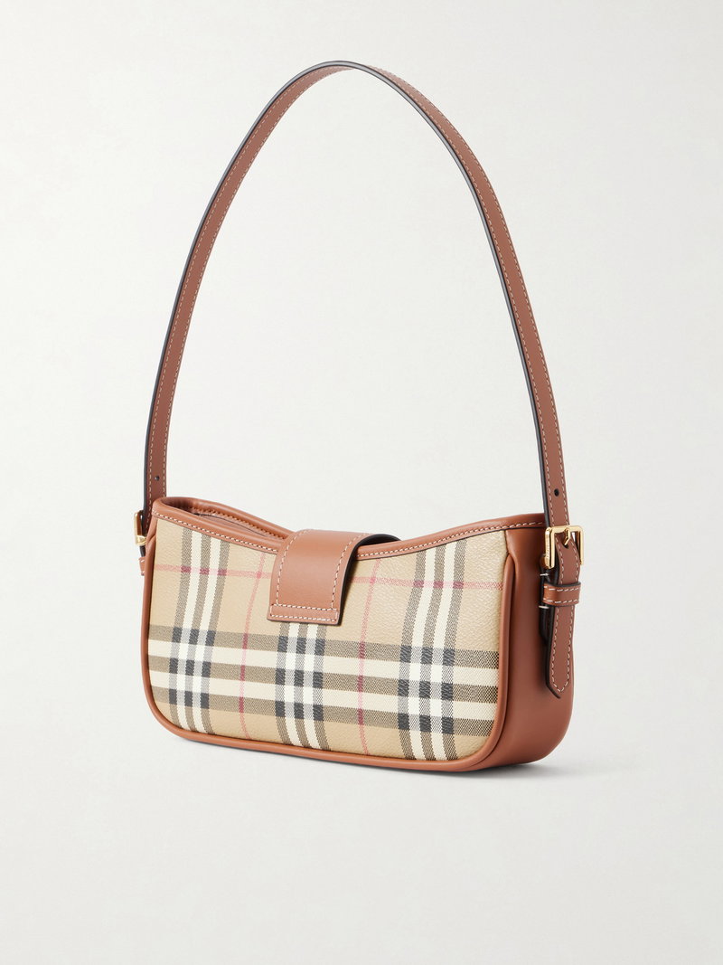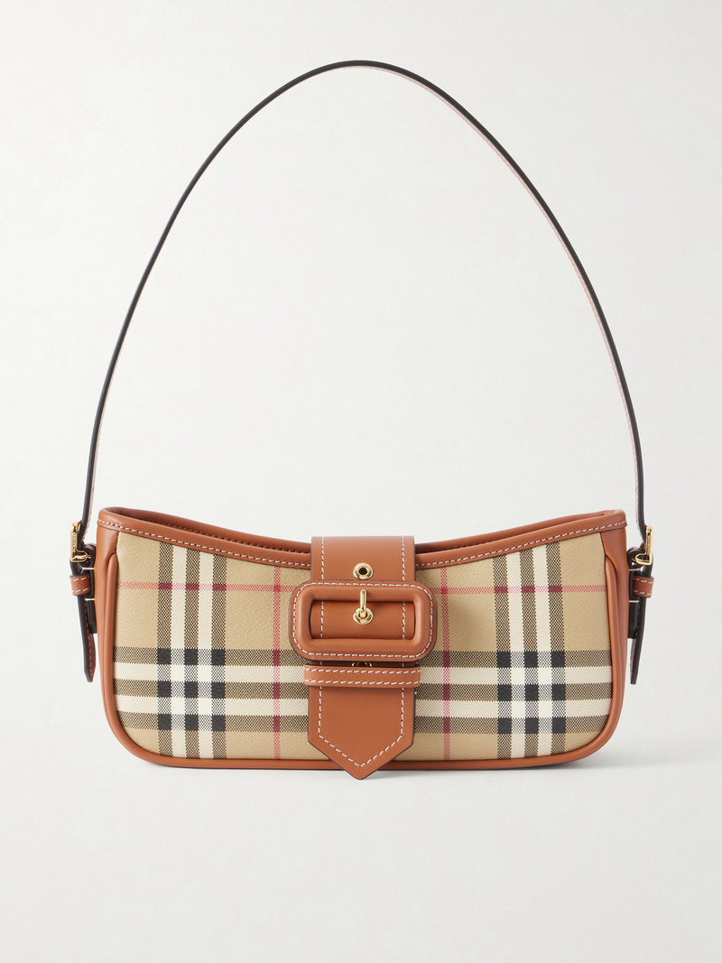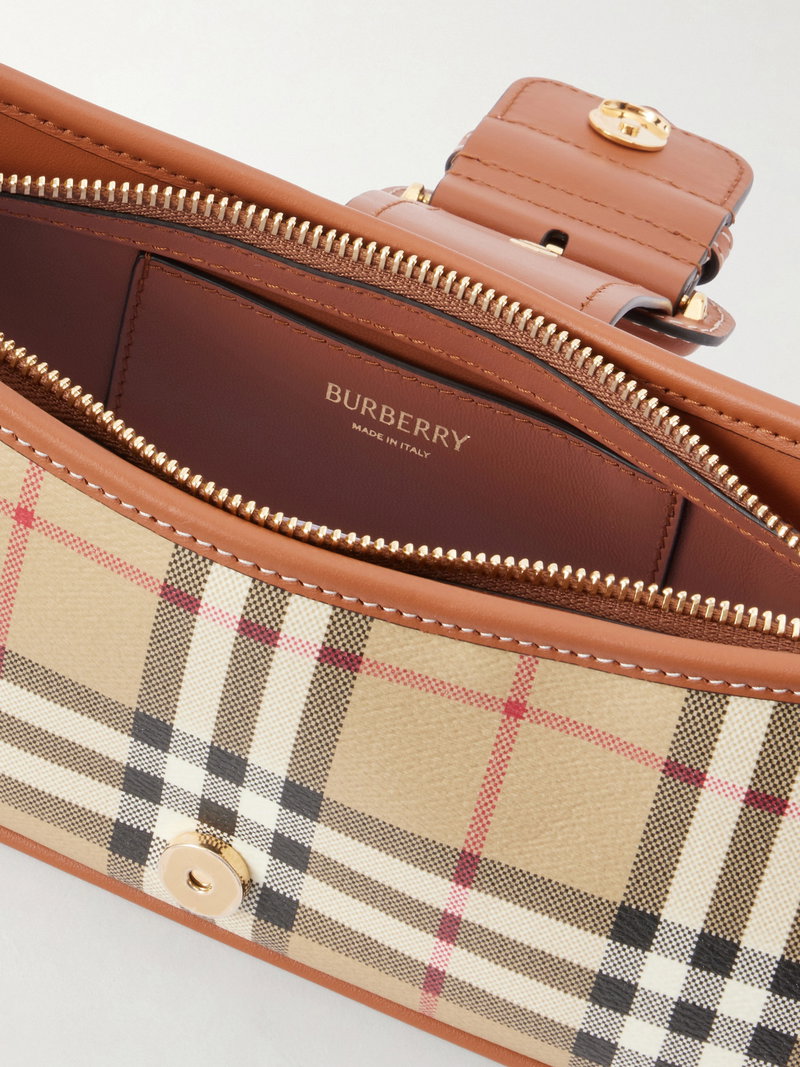 Crafted from canvas in the brand’s signature check, it features a rectangular shape with leather trim and offers enough space for small essentials like a phone, cardholder, and keys.