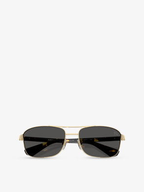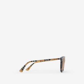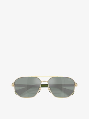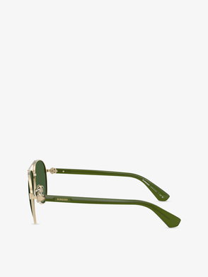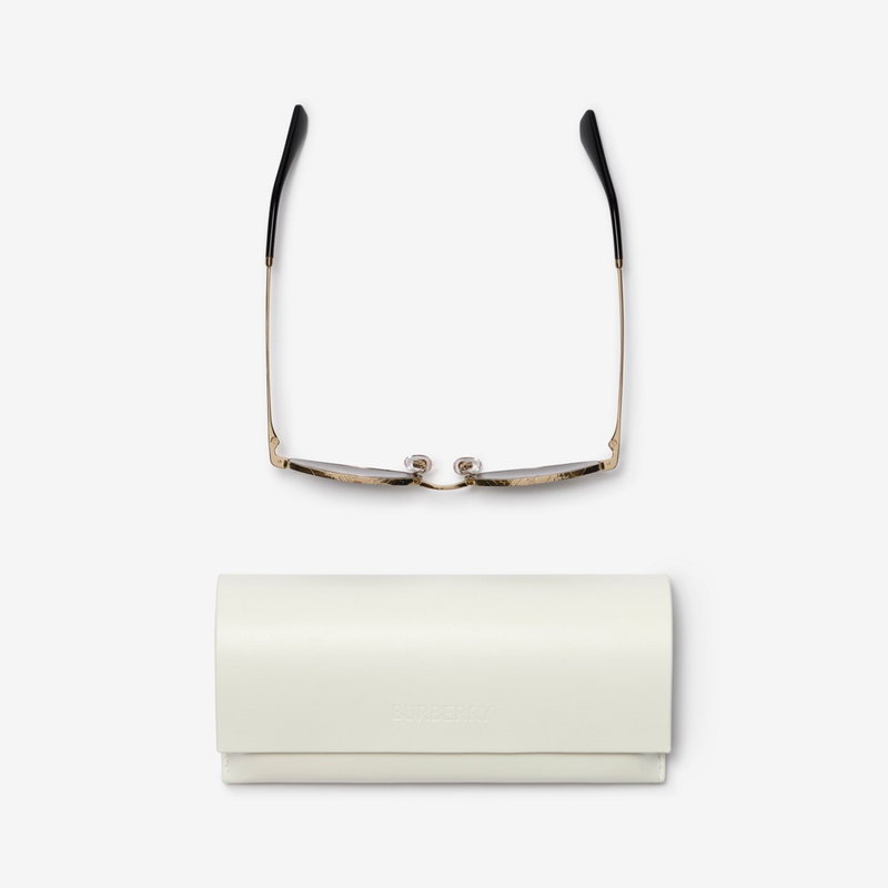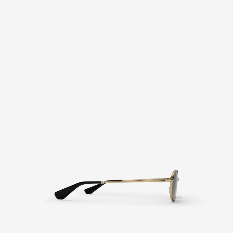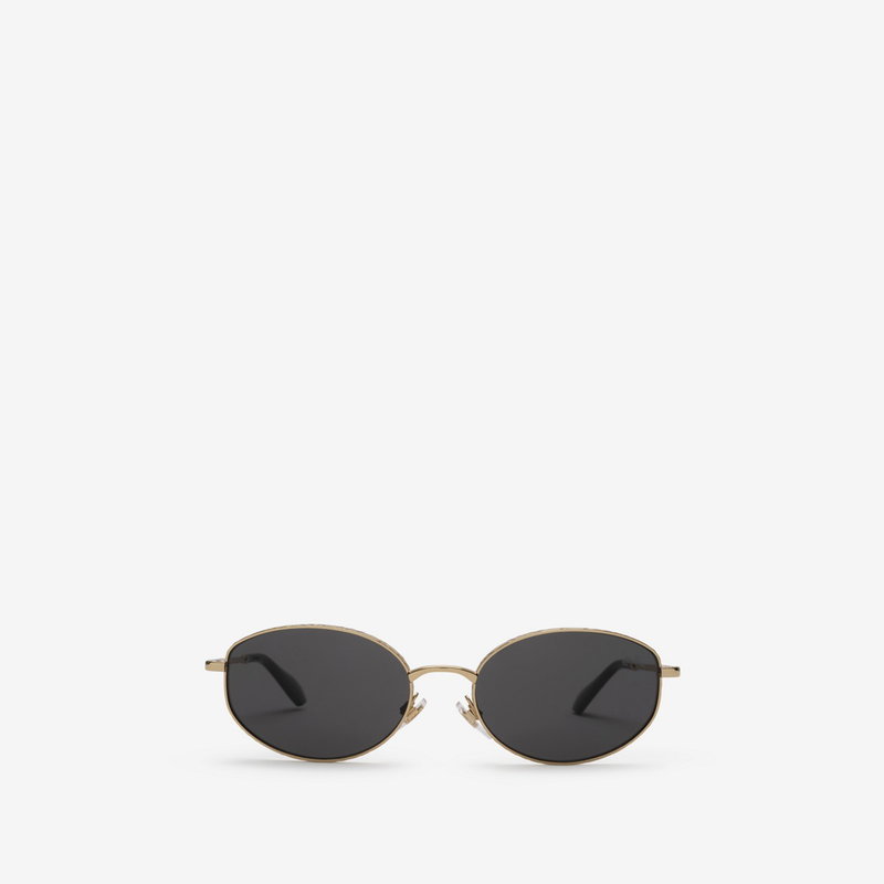 A pair of oval sunglasses made in Italy from metal with nylon temple tips. The slender silhouette is laser-engraved with our logo and the Burberry Check, referencing the hardware of some of the brand’s most iconic bags.