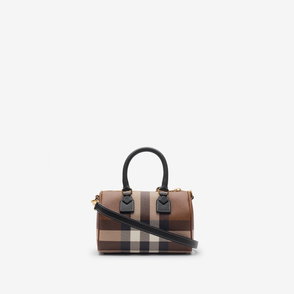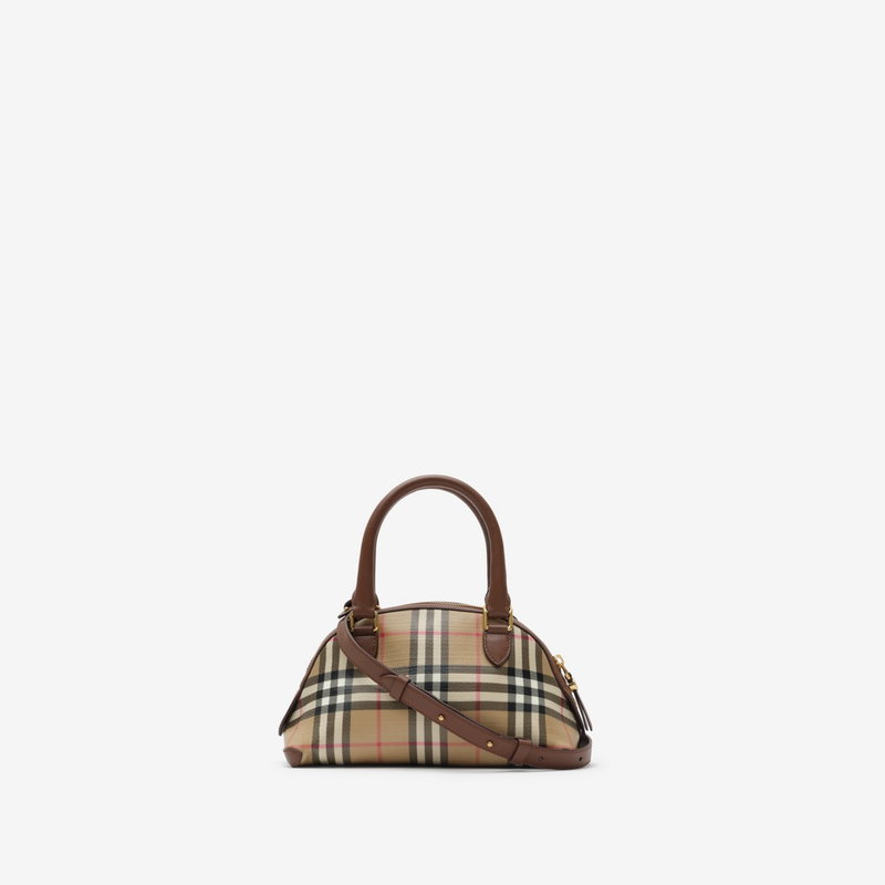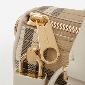 A structured mini bag crafted in Italy from coated cotton canvas, trimmed with smooth calf leather. Printed with the Burberry Check in archive beige, the semi-circle silhouette features a cut-out Knight stamp charm and a cotton-lined interior sized for everyday essentials, including a phone, make-up pouch and sunglasses. Carry by the top handle or wear crossbody with the adjustable strap.
