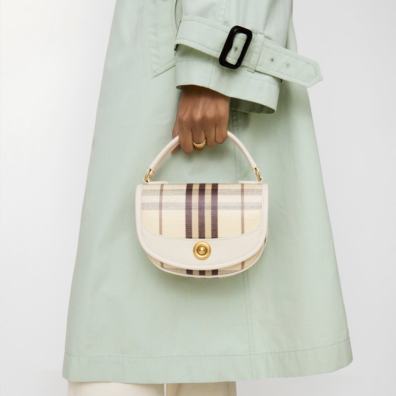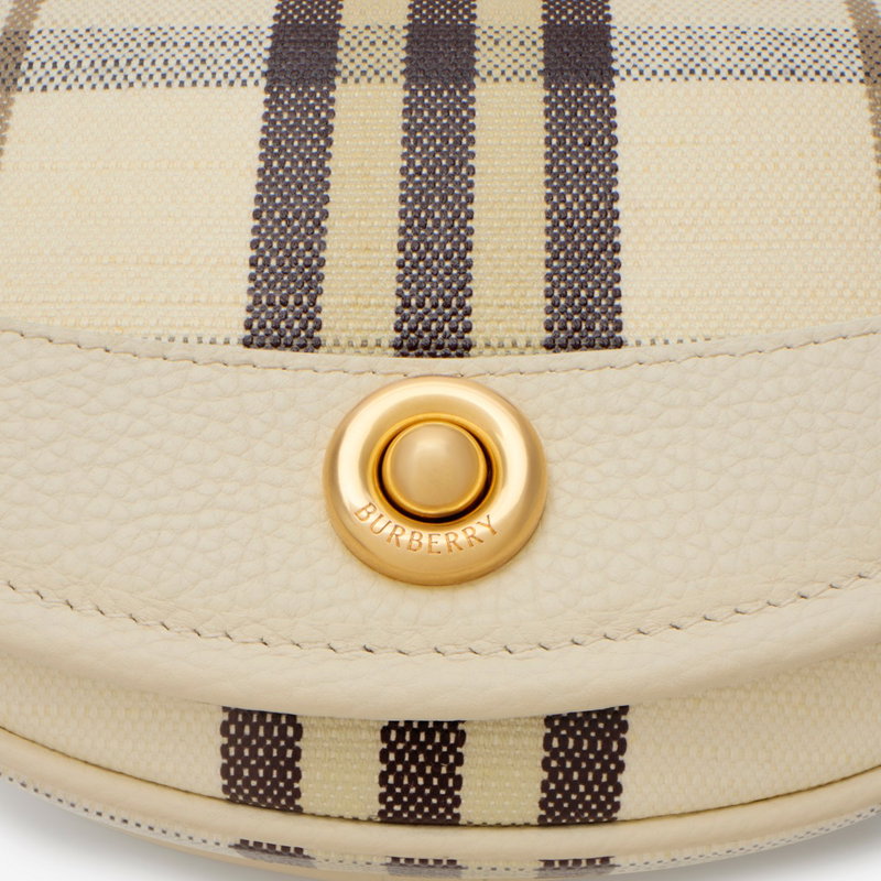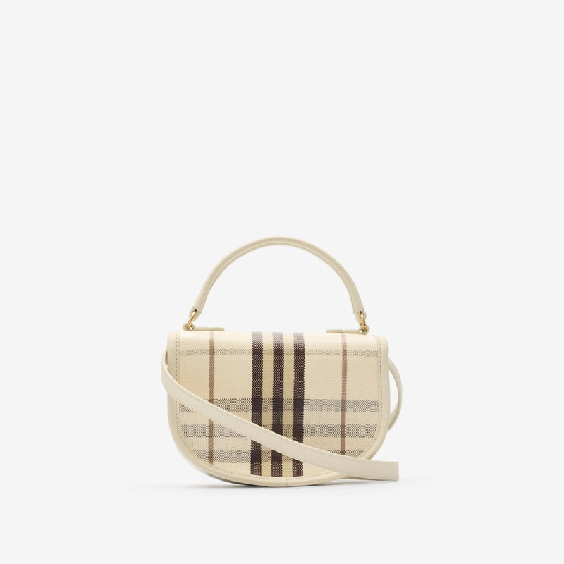 Rooted in the outdoors, the mini Highlands bag is made in Italy from a cotton linen blend trimmed with smooth calf leather and lined in cotton. The fabric is jacquard-woven with the Burberry Check and has a coated finish inspired by rainwear.