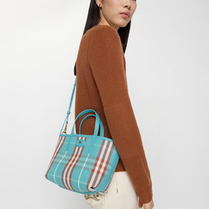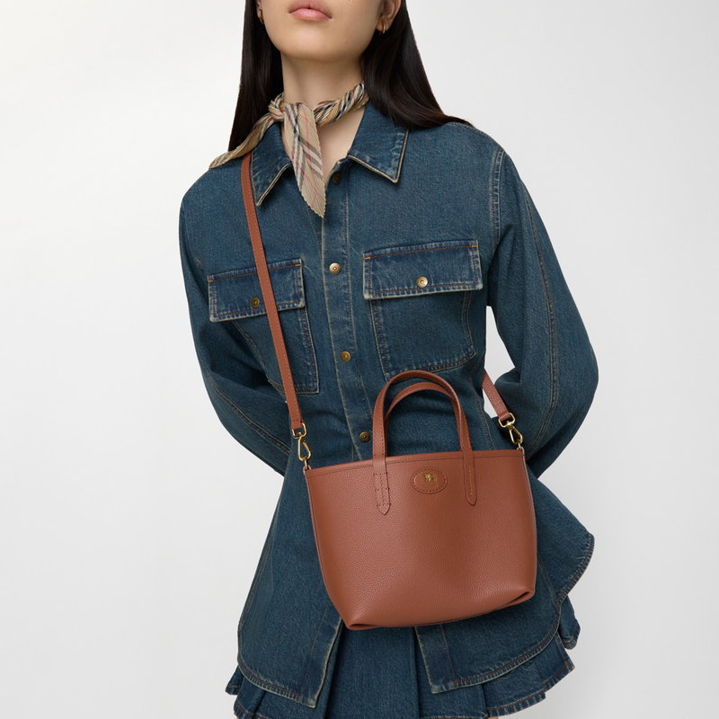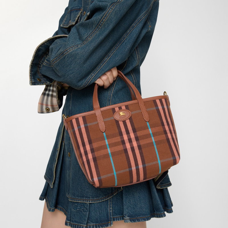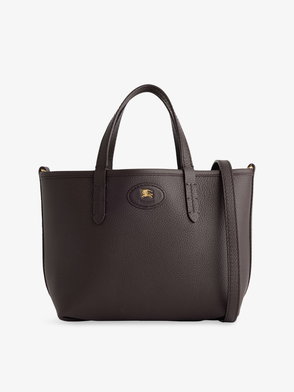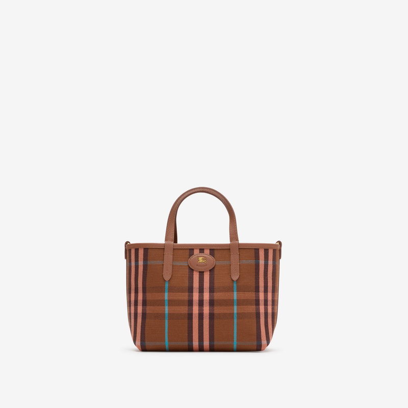 A mini tote made in Italy from grainy calf leather, reversing to a Burberry Check cotton linen blend in a seasonal gingerbread brown colourway. The Bloomsbury collection is finished with a leather and metal Knight stamp, an archival motif first seen on Burberry bags in the 1980s.