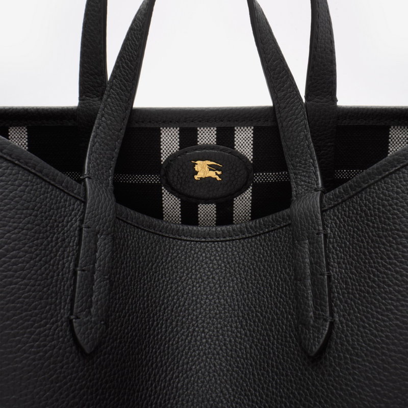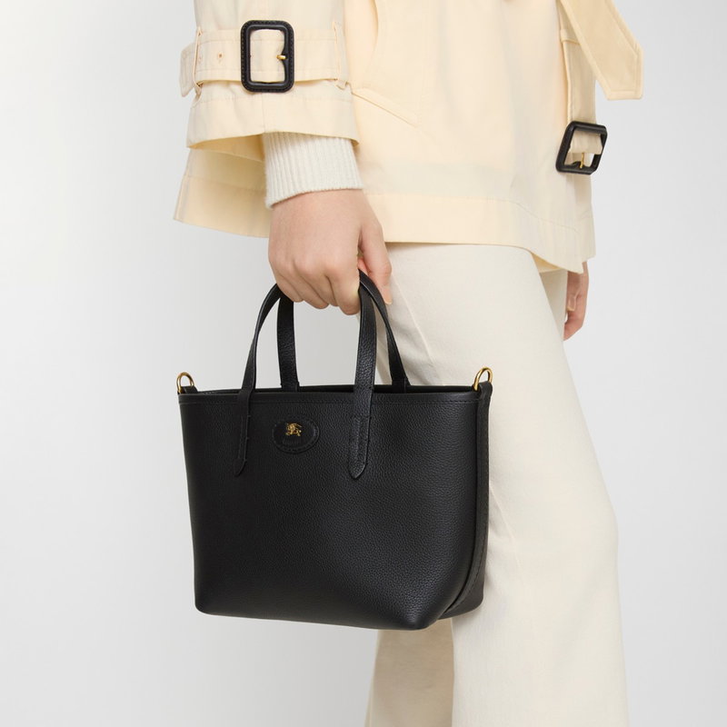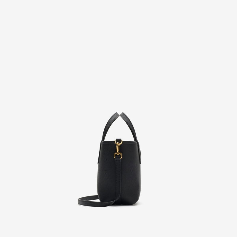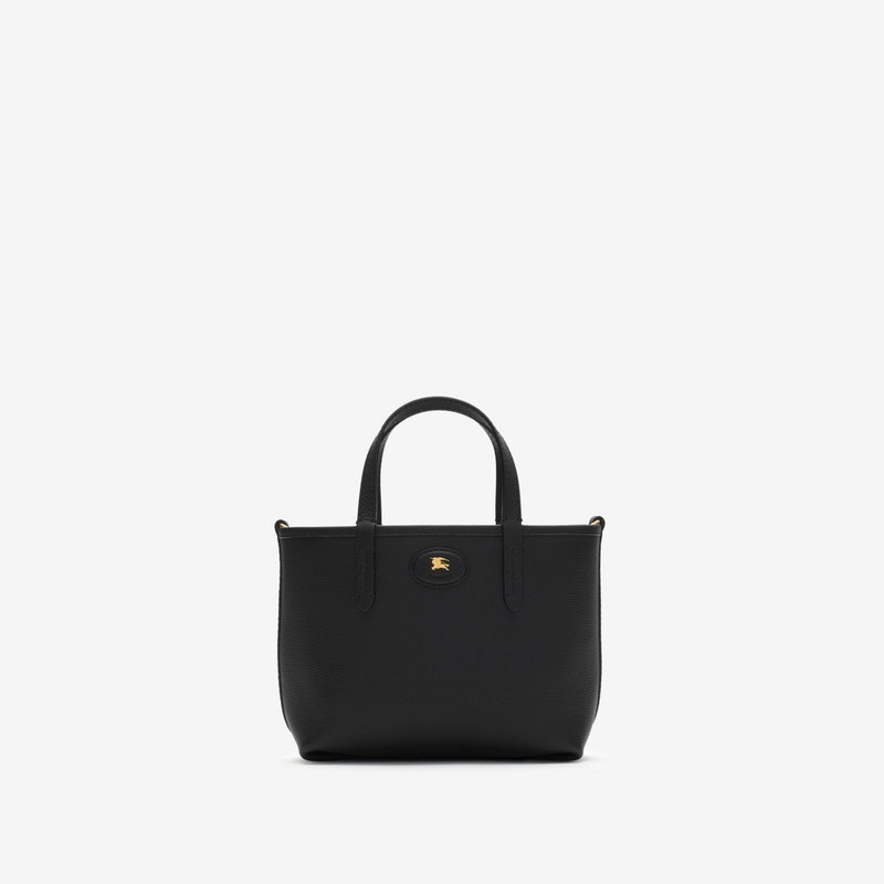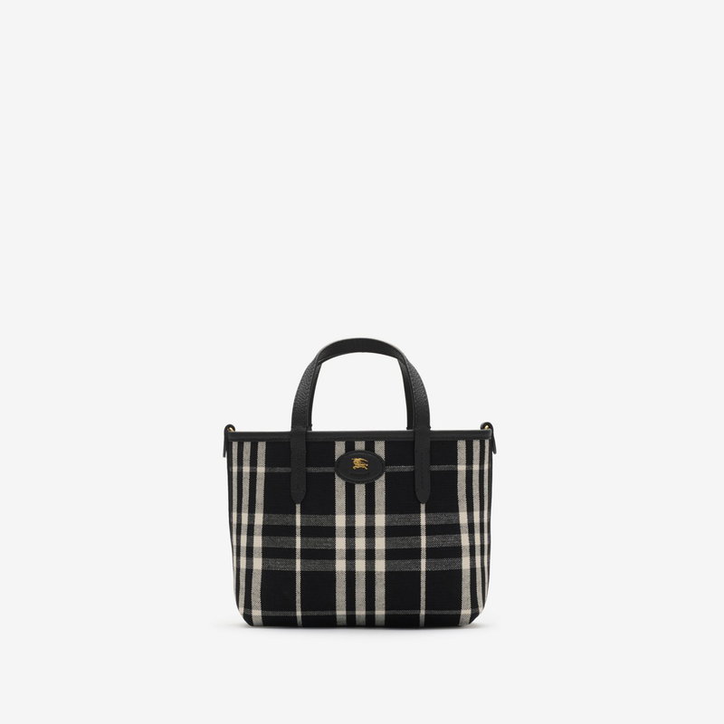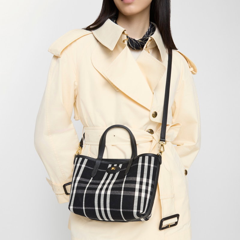A mini tote made in Italy from grainy calf leather, reversing to a Burberry Check cotton linen blend in classic black and calico beige. The Bloomsbury collection is finished with a leather and metal Knight stamp, an archival motif first seen on Burberry bags in the 1980s. Carry by the top handles or across the body using the detachable strap. Top handles Detachable, adjustable strap Hand-painted edges Brushed metal hardware Leather patch with Equestrian Knight Design at front Comes with a dust bag