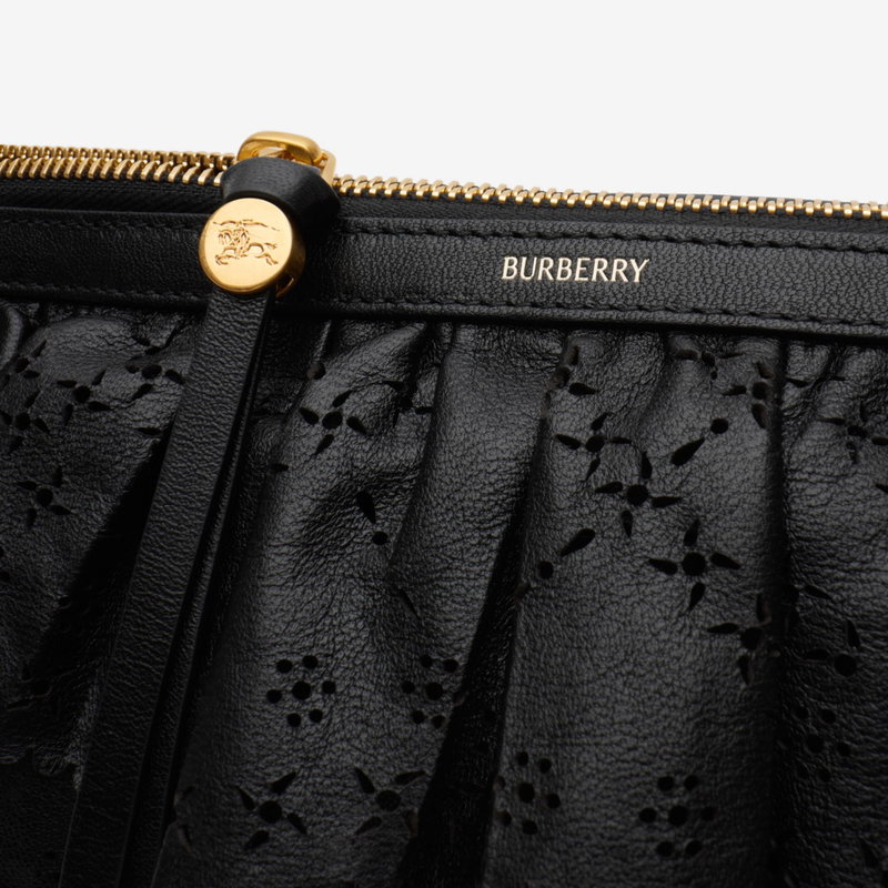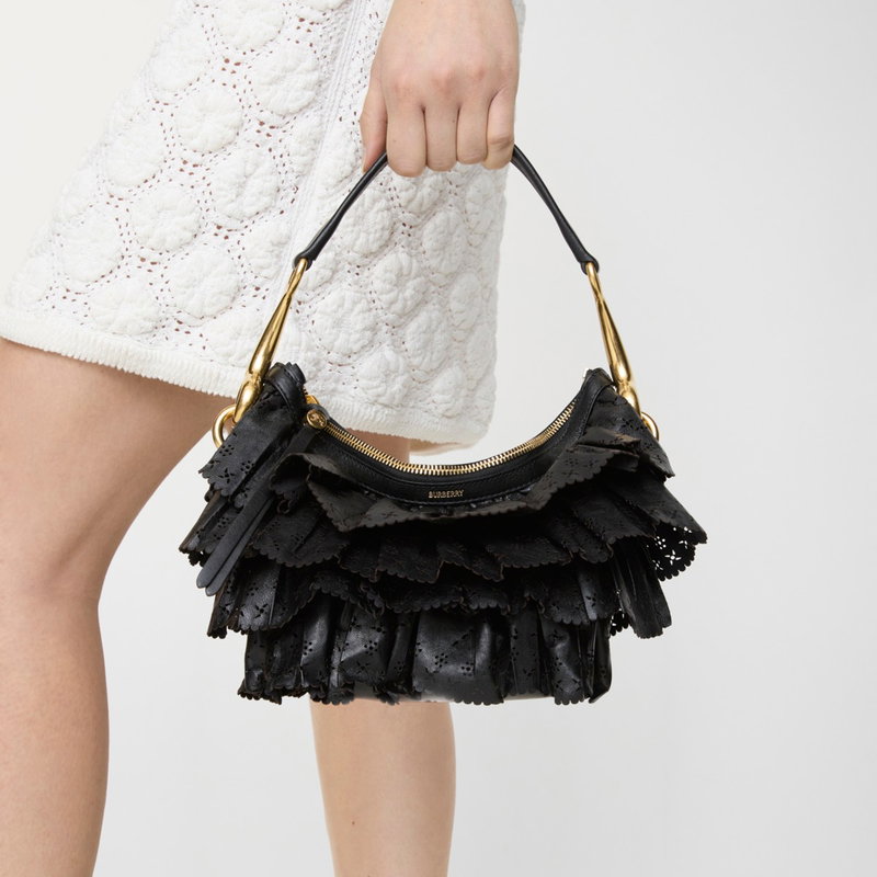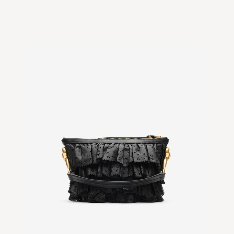 Inspired by the delicate folds of flower petals, the new Ruffle bag is crafted in Italy from soft nappa leather, perforated with floral motifs. The distinctive mini shape is topped with our signature 'b' hardware and a handle wrapped in hand-stitched leather, echoing the bridle reins used for horse riding. Inside the bag is lined with supple suede.