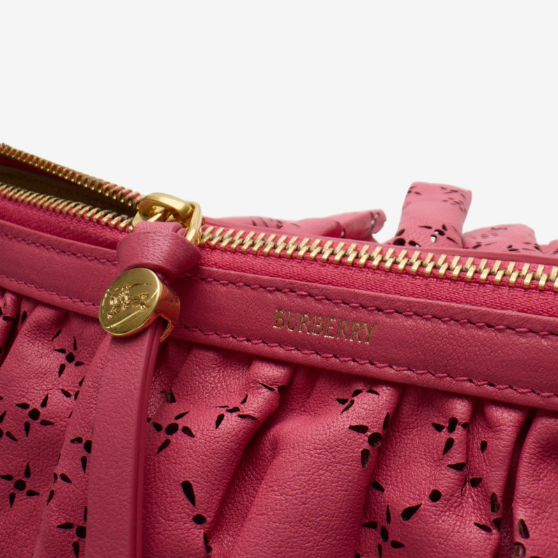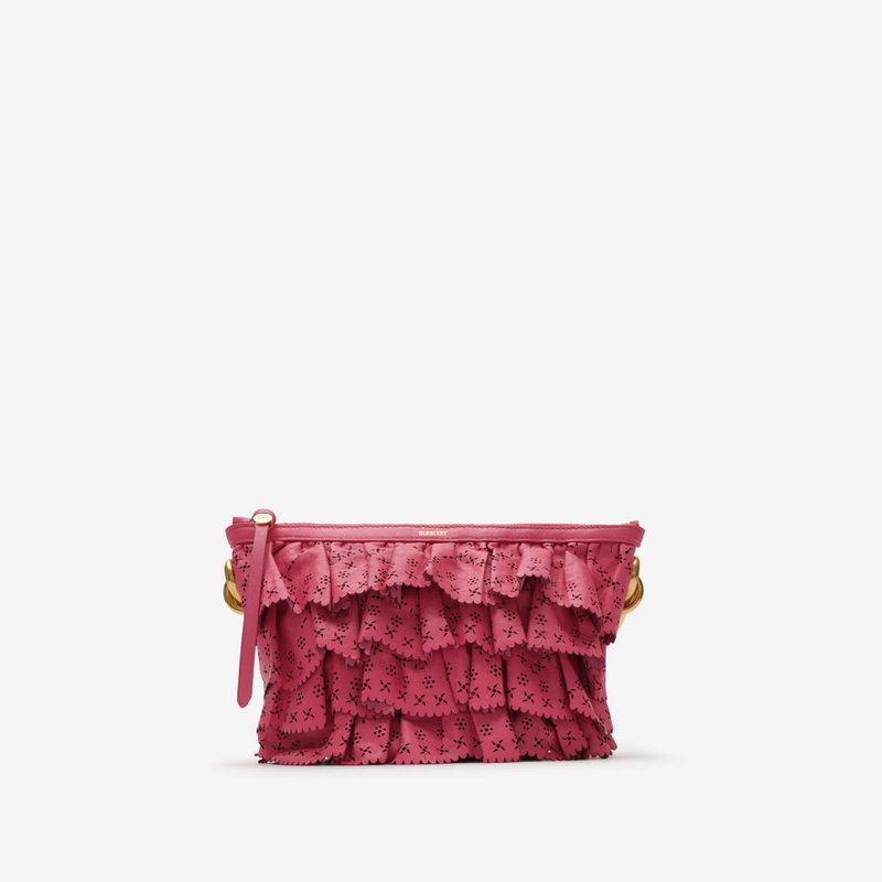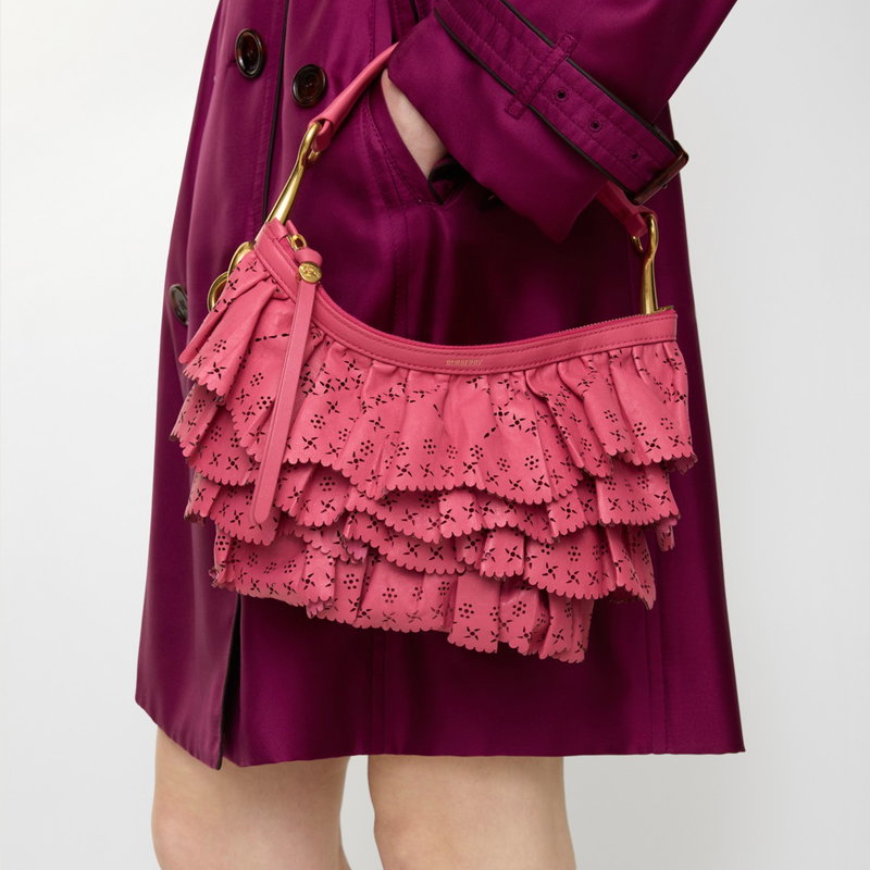 Inspired by the delicate folds of flower petals, the new Ruffle bag is crafted in Italy from soft nappa leather, perforated with floral motifs. The distinctive mini shape is topped with our signature 'b' hardware and a handle wrapped in hand-stitched leather, echoing the bridle reins used for horse riding. Inside the bag is lined with supple suede.