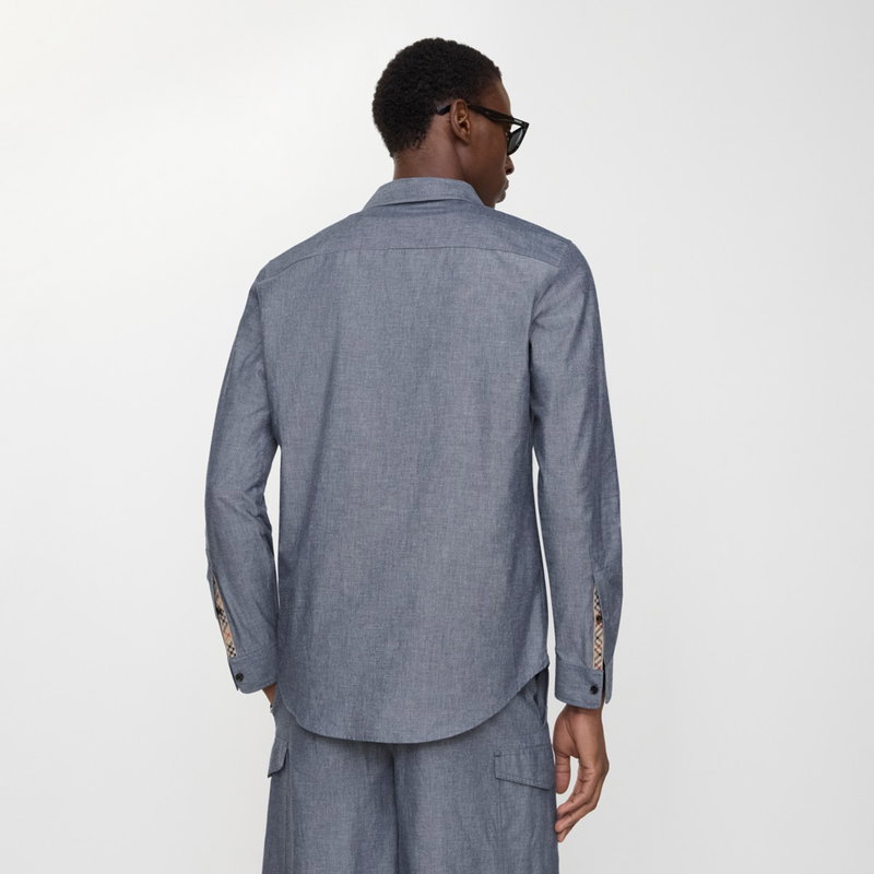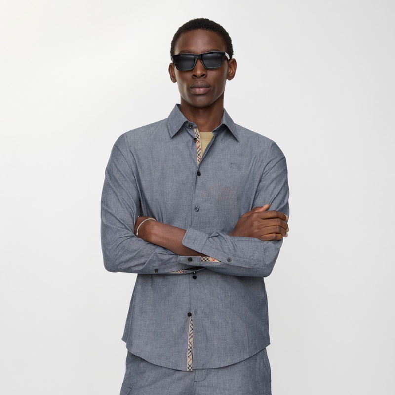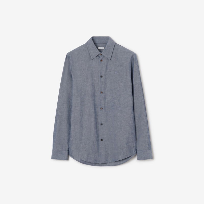A long-sleeved shirt made from cotton blend chambray, lined with Burberry Check at the placket and cuffs in signature archive beige. The style is tailored to a regular fit and embroidered with a tonal Equestrian Knight Design.