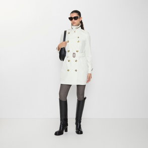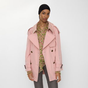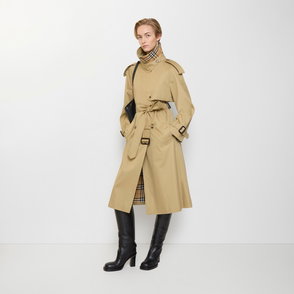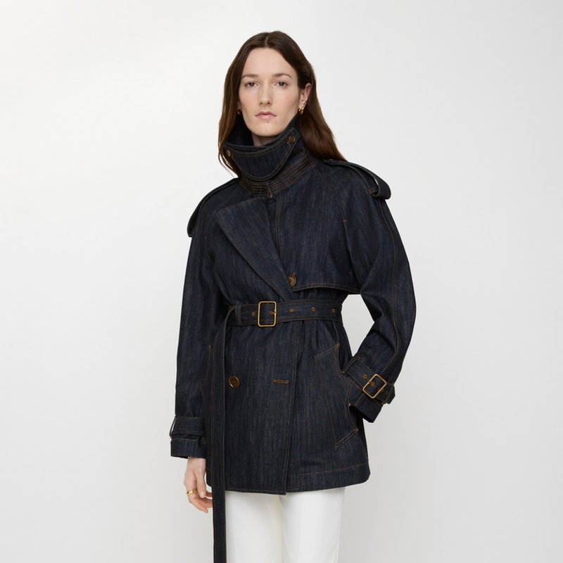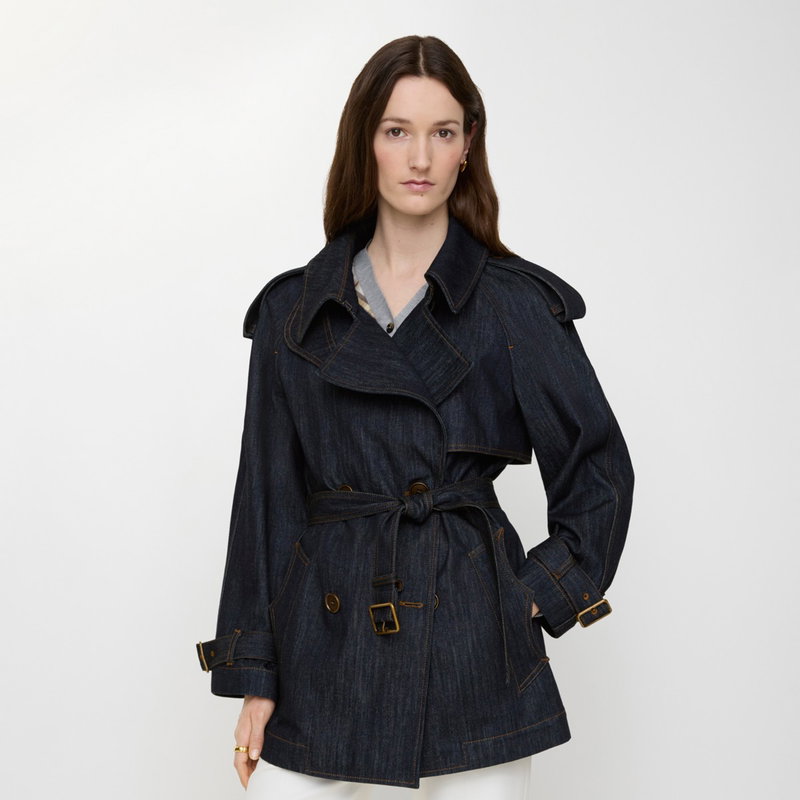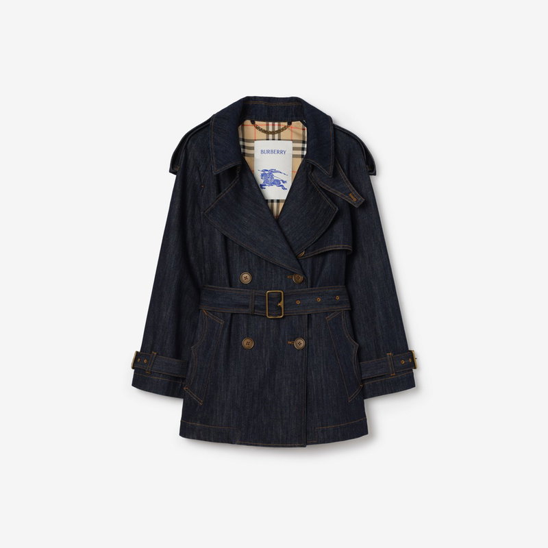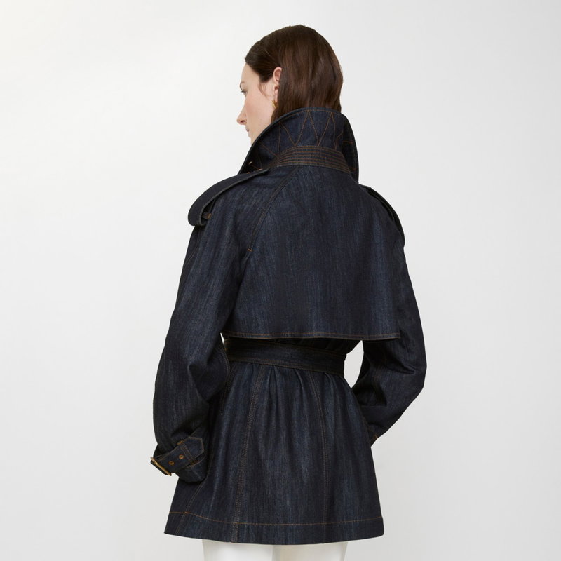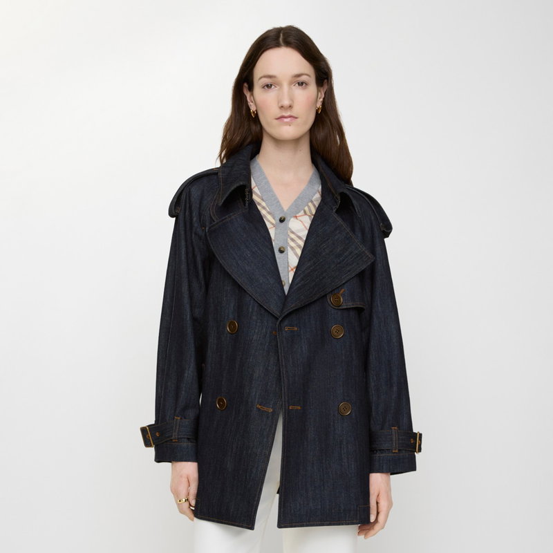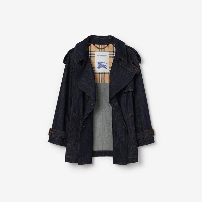Shaped for volume, this new edition of the Fitzrovia trench coat is crafted from denim detailed with topstitching and hardware in an antique finish. The A-line style is cut to a relaxed fit with unstructured shoulders and wider sleeves, while an archival trench inspires the curlicue shape of the pockets. The storm shield - a heritage detail designed to allow rain to run off the back - is exaggerated to emphasise the coat's flowing line. Inside is a Burberry Check cotton lining in signature sand beige.