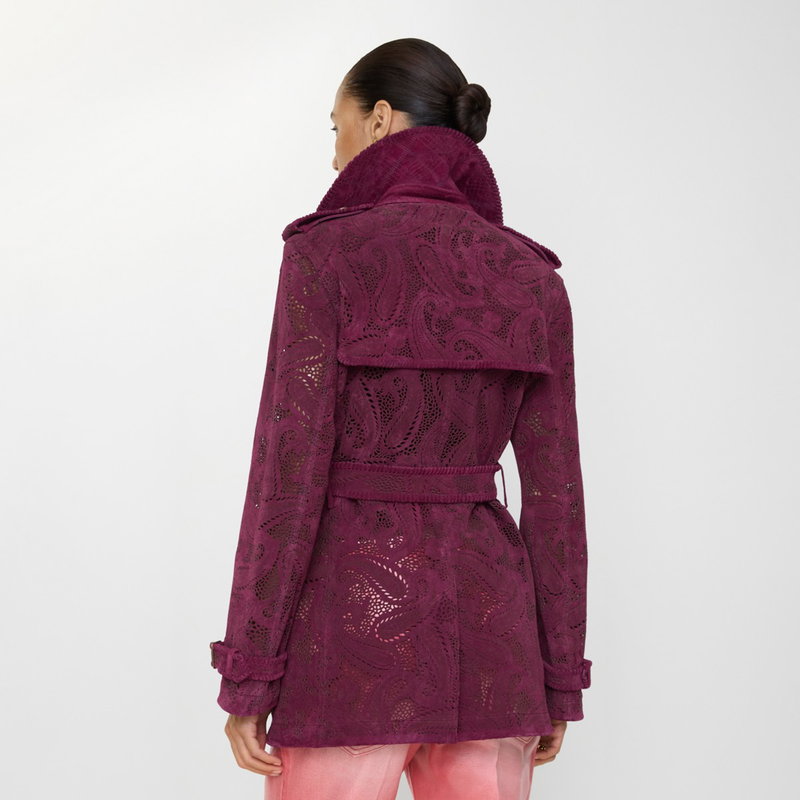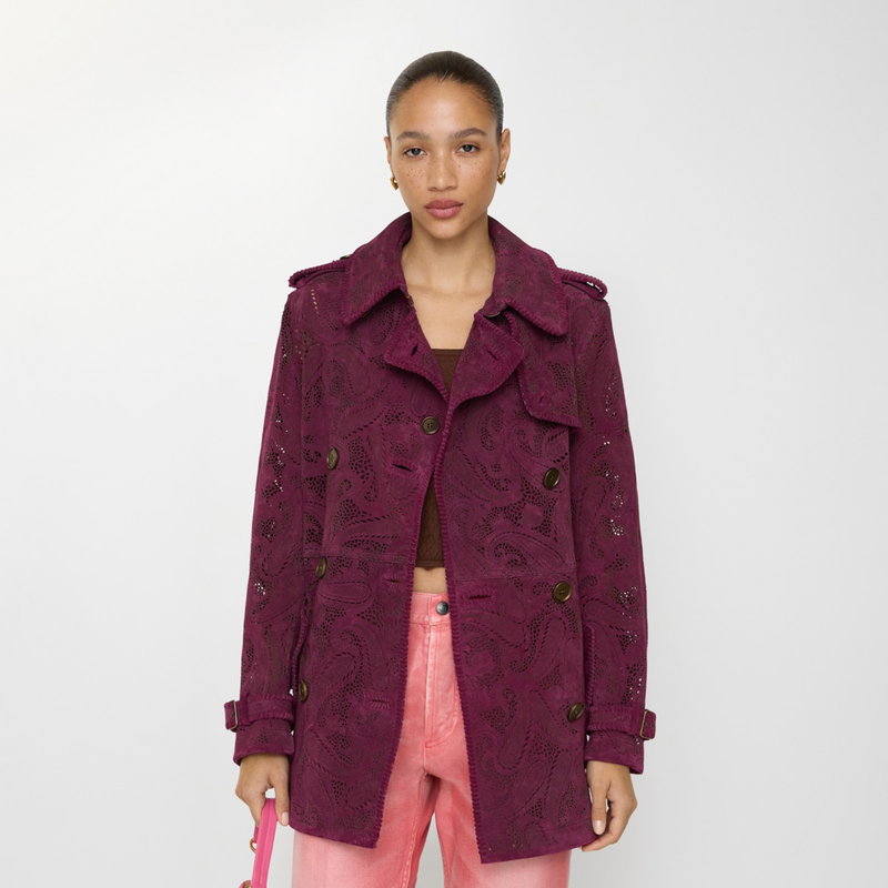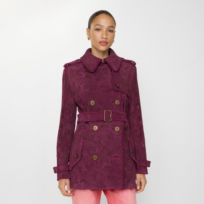The Foxfield trench coat is reworked in soft suede and intricately laser-cut with a paisley pattern. Debuted on the Burberry Summer 2026 runway, the design is detailed with check stitching under the collar and antique-finish metal hardware.