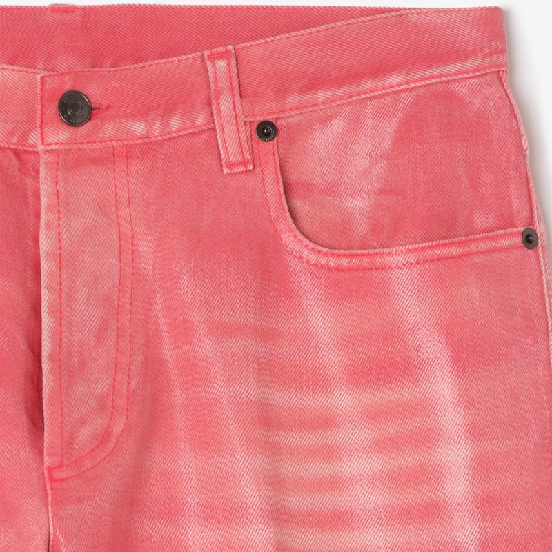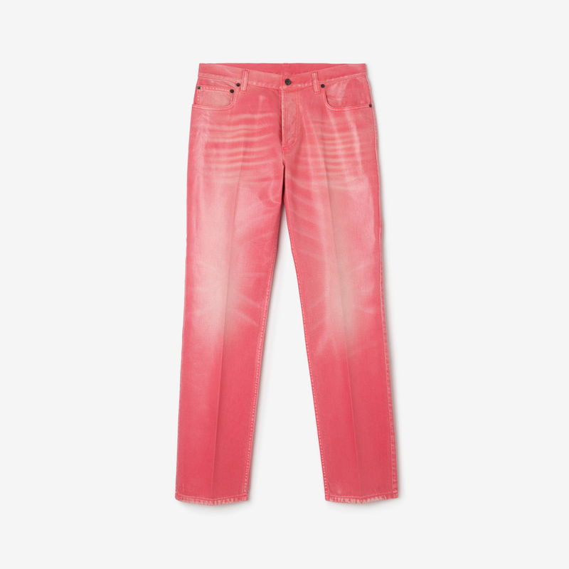 A pair of jeans made from coated denim in a vibrant cherry pink hue, debuted on the Burberry Summer 2026 runway. The five-pocket style is cut to a slim fit and detailed with a suede patch featuring our Equestrian Knight Design in antiqued metal. Team with the matching tailored jacket for a fresh take on formalwear.
