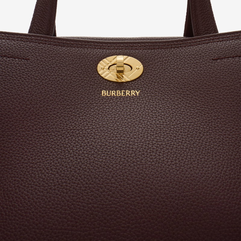 A timeless tote made in Italy from grainy calf leather, with Burberry Check side panels and a matching signature sand beige lining. Compact yet spacious, the design is finished with a check-engraved closure and D-ring hardware inspired by the belt from our iconic trench coats. Carry by hand or on the shoulder using the strap.