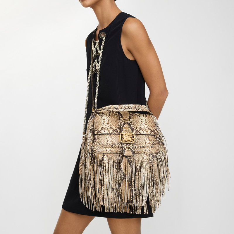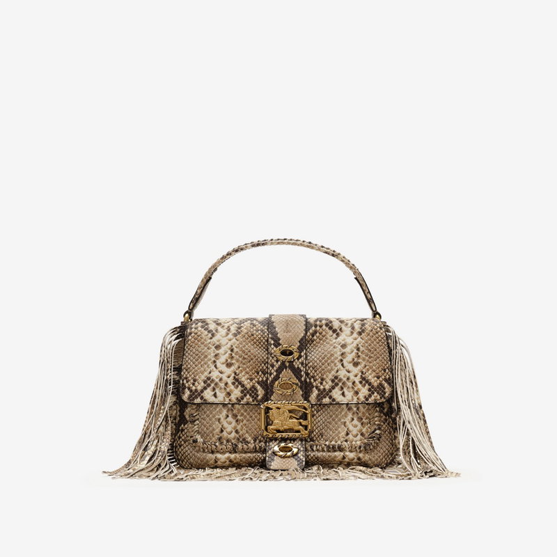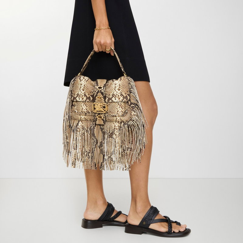 The iconic Knight sits at the centre of the new Rider bag. Crafted in Italy from python-print leather, treated with oil and wax for a soft finish and rich sheen, the striking top-handle shape features exaggerated fringing and whipstitched trims. Debuted on the Burberry Summer 2026 runway, the bag is distinguished by a polished metal Equestrian Knight Design and matching oval eyelets. Use the detachable strap to style as a crossbody.
