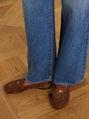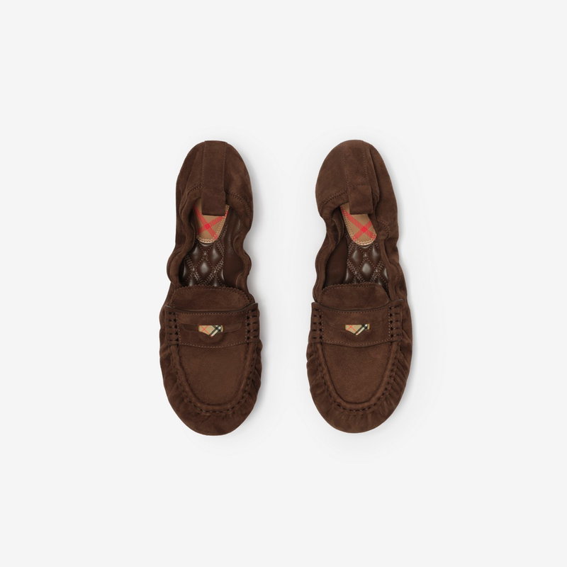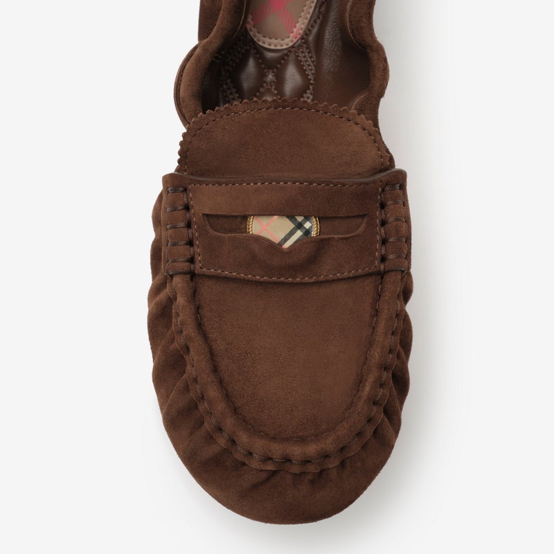 A pair of gathered loafers made in Italy from soft suede, detailed with a Burberry Check plaque. The quilted leather insole is padded for comfort and the sole is moulded with the Equestrian Knight Design in signature Knight Blue.