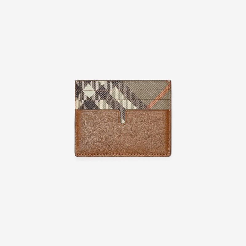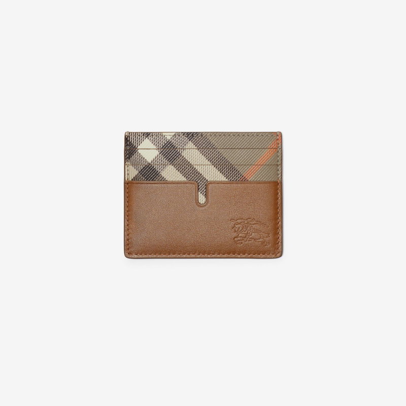 A card case made from calf leather with a pop of Burberry Check in seasonal finch brown. The style is finished with an embossed Equestrian Knight Design.