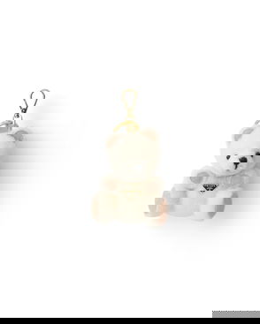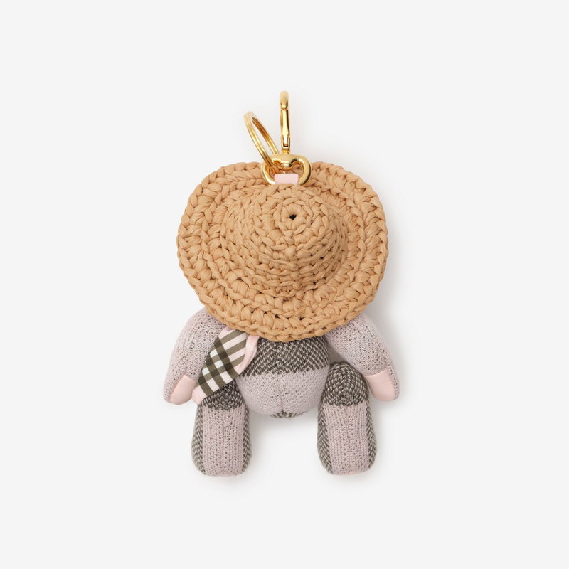 The signature teddy charm in check wool, wearing a Burberry Check satin scarf and raffia hat - a nod to summer days spent in English country gardens.