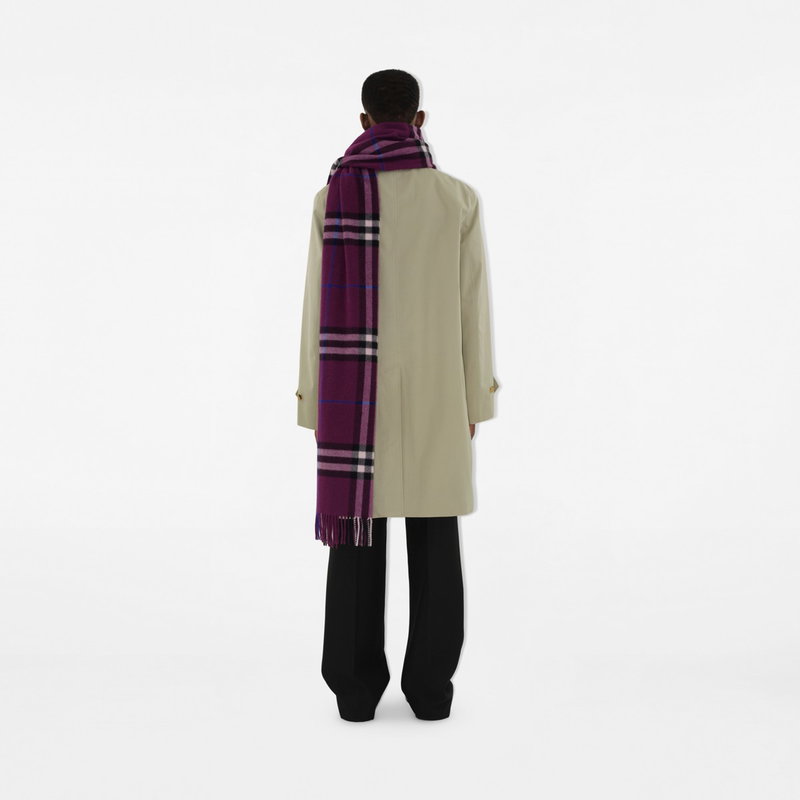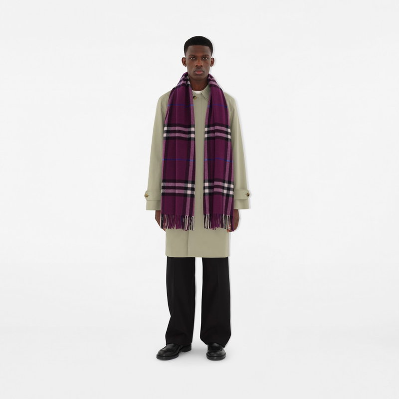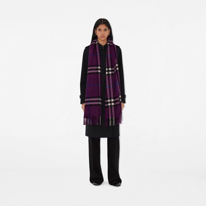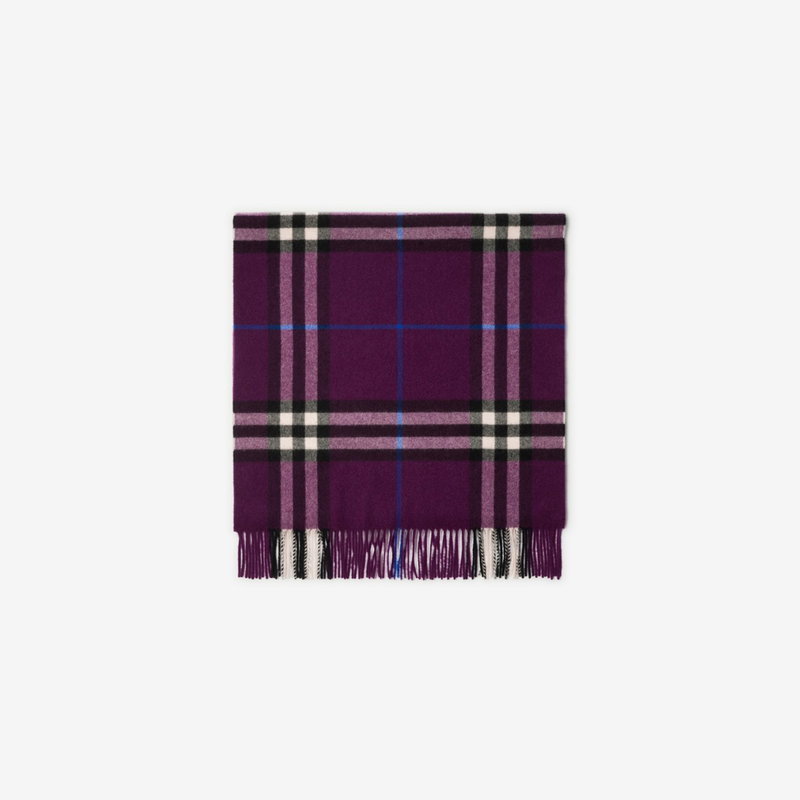 A Burberry Check cashmere scarf, made in Scotland at a mill founded in 1797. Woven on traditional looms, the fabric is washed in local spring water and brushed with teasels - dried flowers that are drawn along the surface of the cashmere to 'raise' the cloth, creating a natural lustre and ultra-soft finish. Two further washes are given for a fuller texture. Rectangular Fringing at both ends