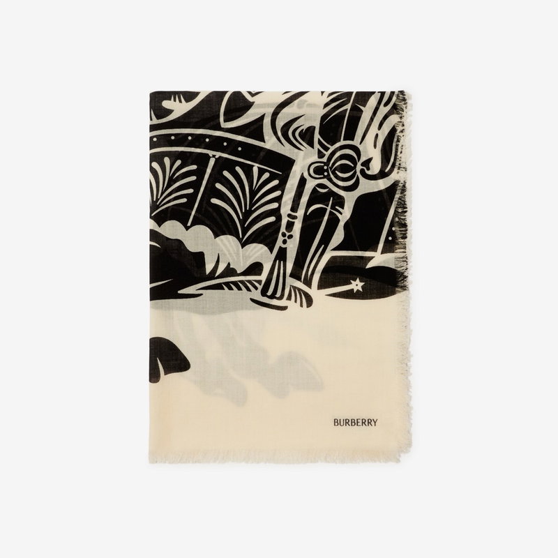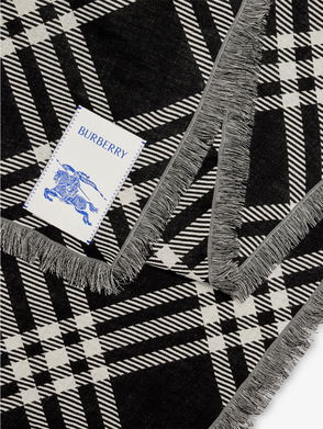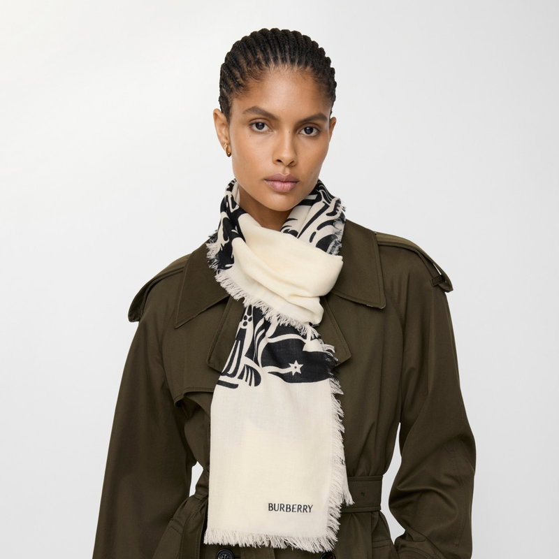 The lightweight style is bordered with delicate fringing. Rectangular Eyelash fringing at edges Printed Burberry lettering at corner