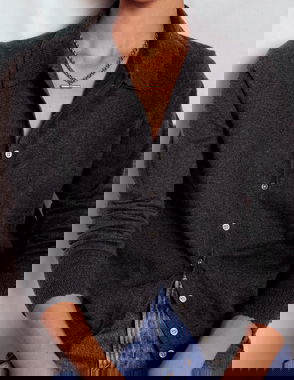 Cardigan, Mélange, Knitted, Open front, Two front patch pockets, Slips on, Mid-weight knit.
