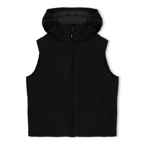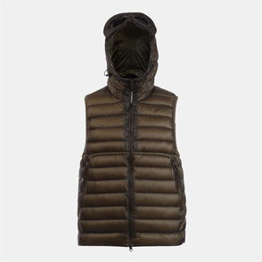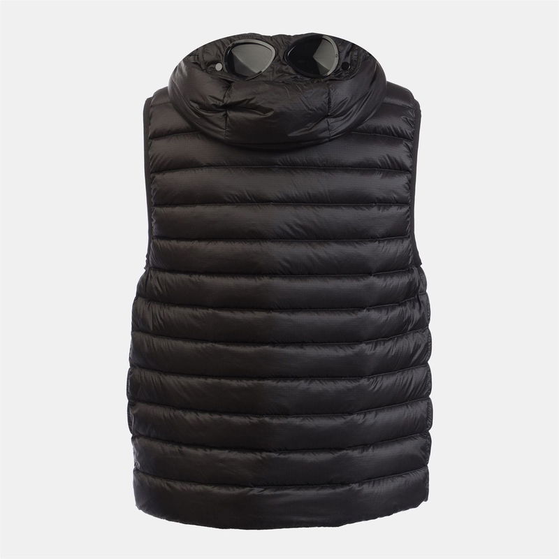 Mens C.P. Company D.D. Shell Goggle Down Gilet in black. Large adjustable drawcord fastening hood. Signature CP Company Goggles and press stud fastenings. Full zip fastening. Zipped pockets. Inner pocket. Two large arm holes with elasticated trims. Adjustable drawcord fastening on the waistband.