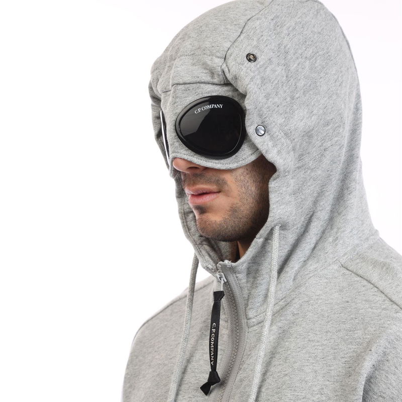 Mens C.P. Company Diagonal Raised Fleece Goggle Zip Hoodie in grey. Adjustable Goggle hood. Side zip pockets. Full zip fastening. Ribbed cuffs and hem. Thumb hole on cuff. Regular fit.