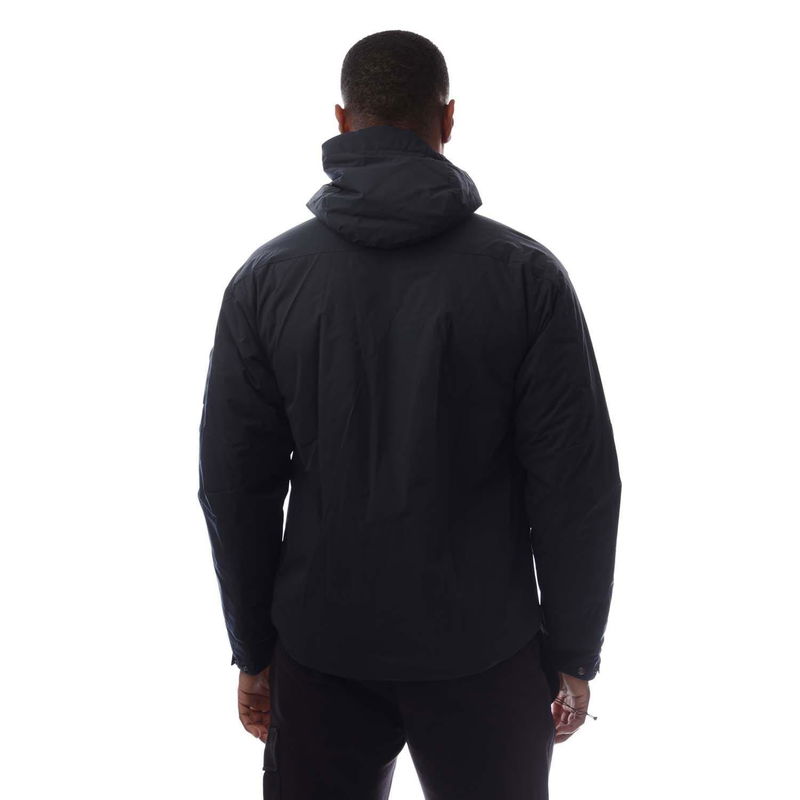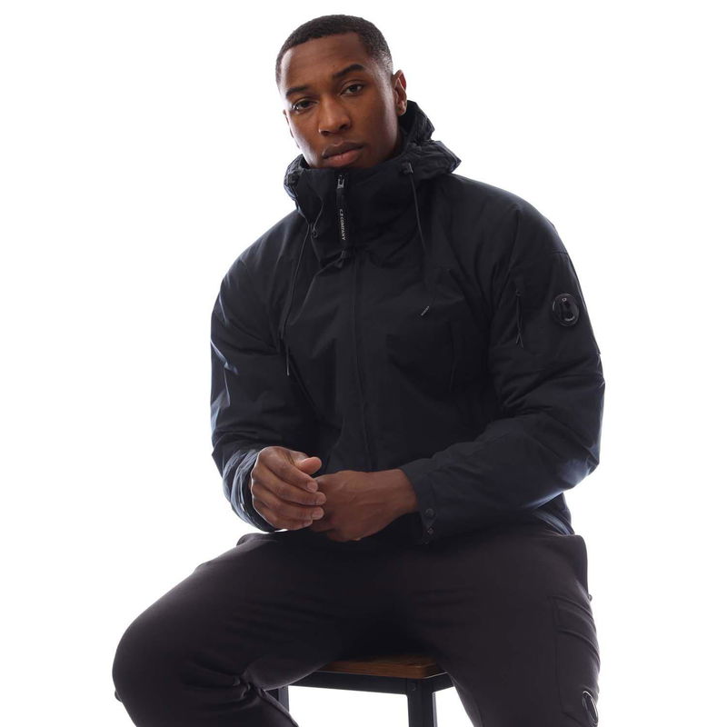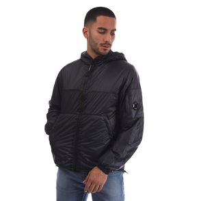 Mens C.P. Company Pro-Tek Hooded Padded Jacket in total eclipse. Hooded padded jacket crafted in Pro-Tek a Polyester mechanical stretch that combines the weight and comfort of a sweatshirt with the protection of an outer layer. Padded with Primaloft, Silver wadding an insulation solution with high thermal and breathability properties. Anti-drop treated.