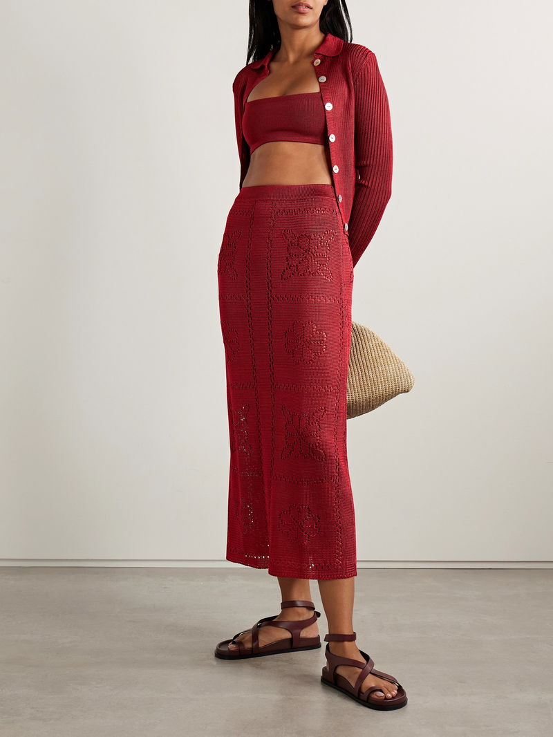 Calle Del Mar's skirt is pointelle-knitted with a delicate floral motif. Wear yours with the coordinate bralette and sandals.