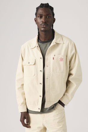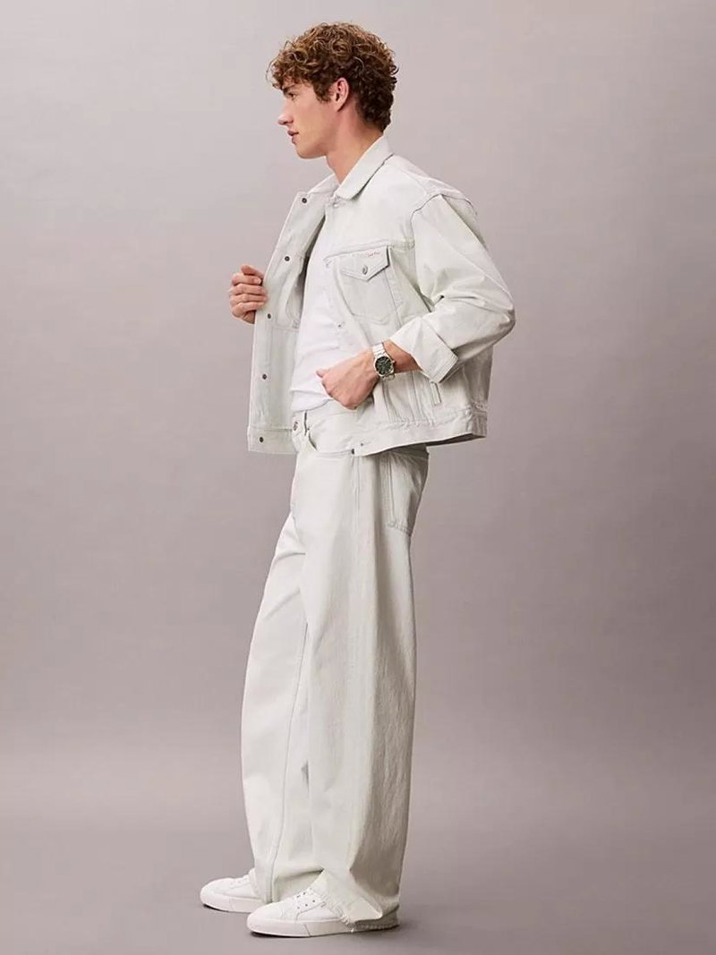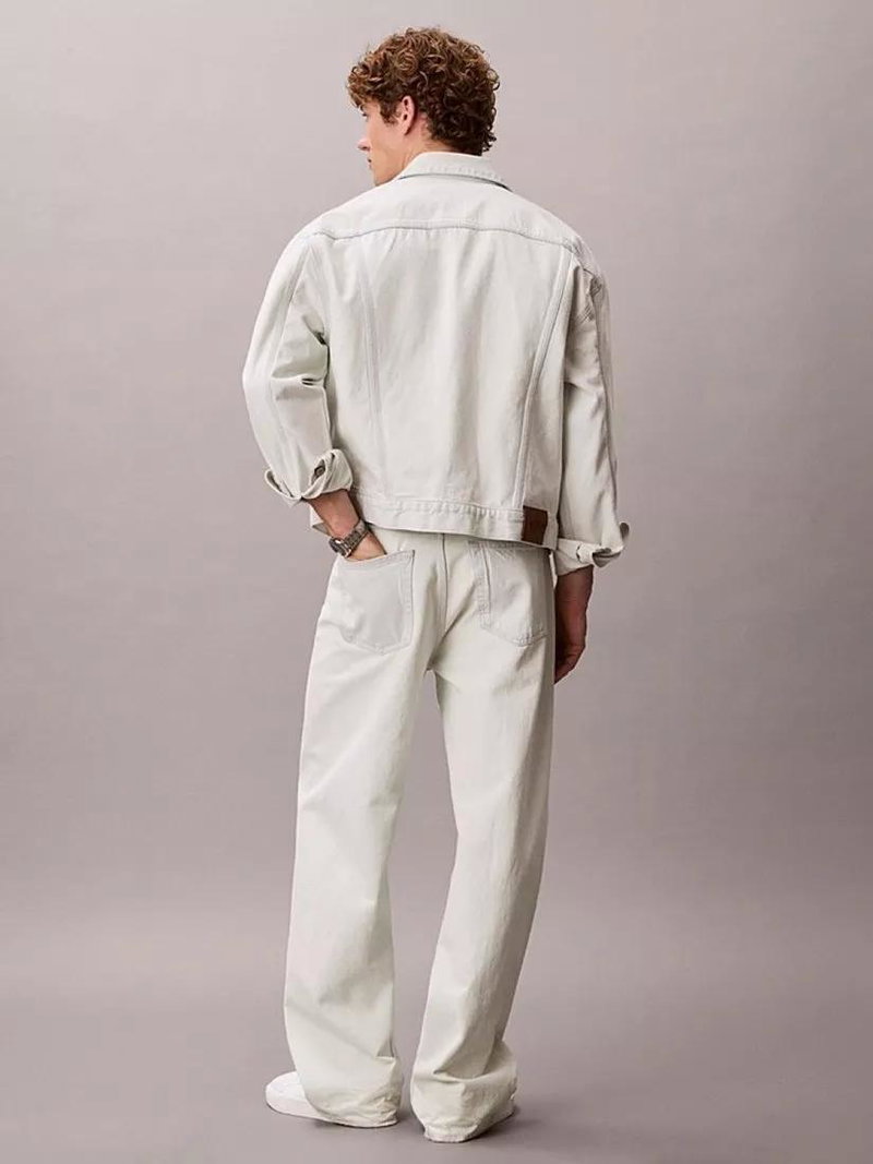 Authentic '90s fit rigid cotton denim jacket with subtle distressing at the seams. It features a pointed collar, branded metal buttons, slit pockets, flap chest pockets and a Calvin Klein leather logo badge.