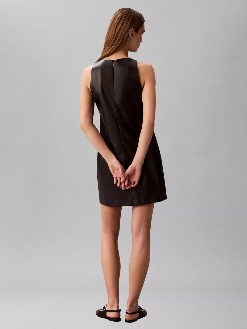 A sleek faux leather mini dress with a modern silhouette and smooth finish, perfect for evening wear or styled-up occasions.
