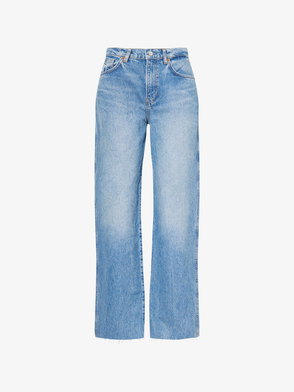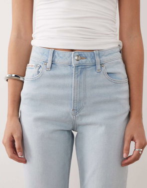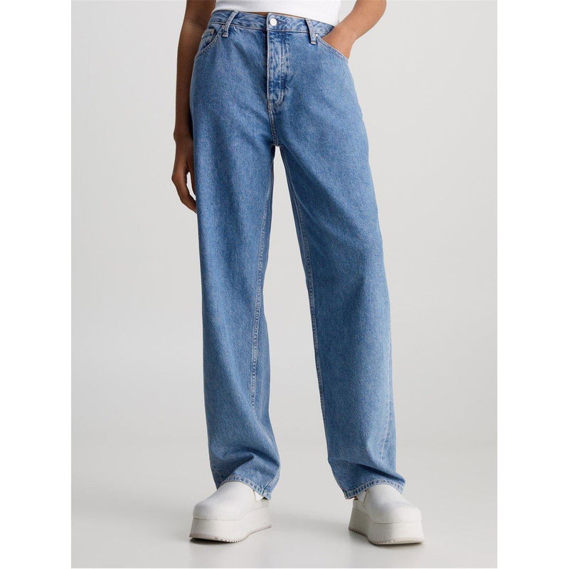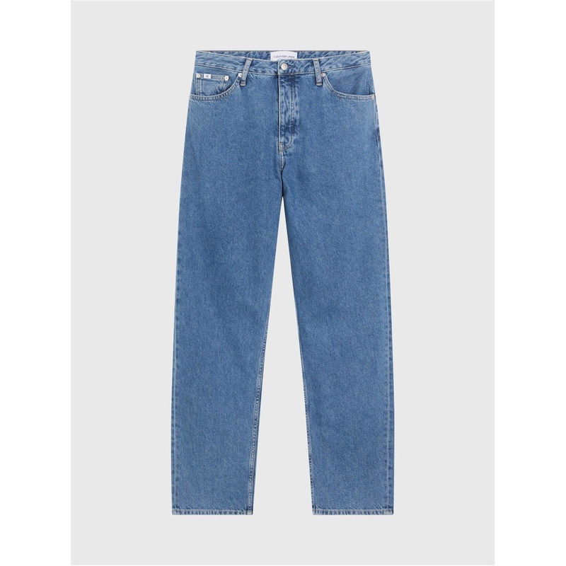 Step into timeless style with Calvin Klein's 90s Straight Jeans. Crafted from a blend of recycled cotton denim, these rigid mid-rise jeans exude an air of effortless style and streetwear. The straight-leg silhouette flatters every figure, while the button fly fastening adds a touch of vintage charm. The mid-blue stonewash lends a cool, lived-in look, perfect for both casual outings and glamorous evenings.