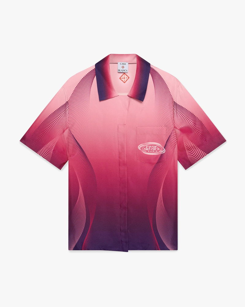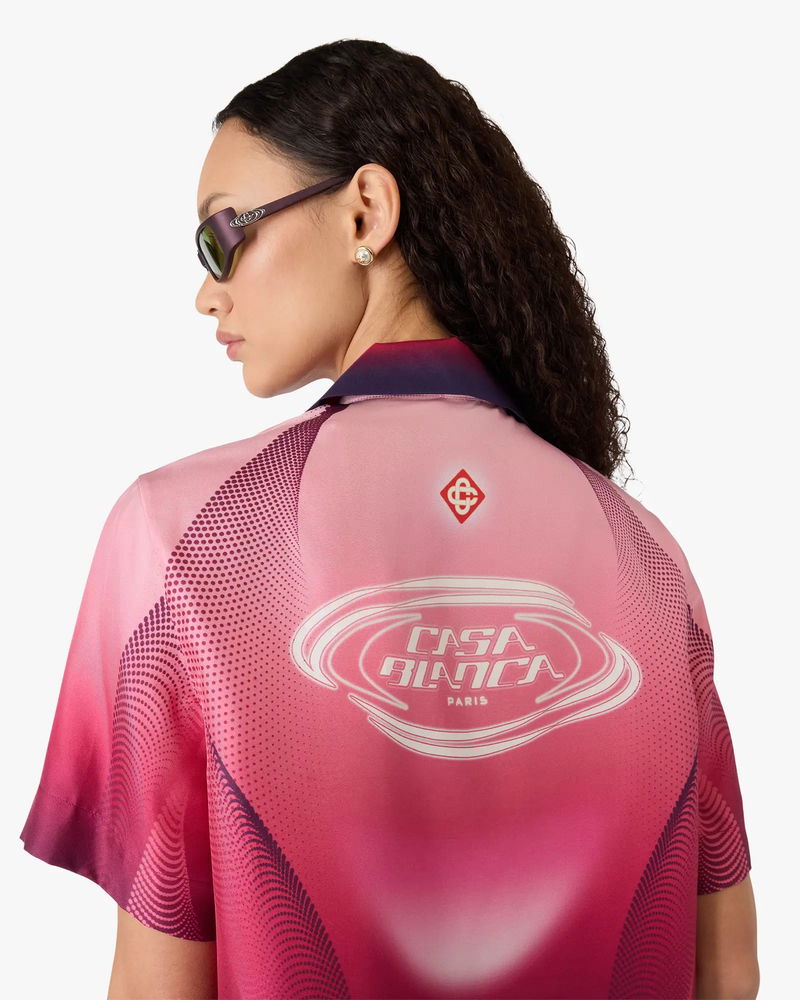 The pink gradient Cuban collar short-sleeve silk shirt is a printed design, featuring the season's gradient artwork emulating the rich colours from the aubergine with the house's warped logo and signature diamond logo. Completed with a Cuban collar, button closure, interlocking CC logo corozo buttons, and gradient edge detail on the collar, with a relaxed silhouette.