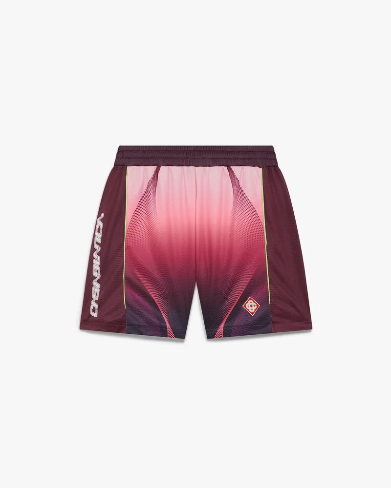 The aubergine gradient football shorts are a refined sportswear design crafted from a gradient printed fabric, featuring the season's gradient artwork emulating the rich colours of the aubergine. Completed with an elasticised waistband, drawstring fastening and in-seam side pockets. Printed birdseye mesh fabric 100% polyester Diamond logo patch Colour: aubergine Delicate machine wash Made in Portugal The model is 185cm / 6'1 and is wearing size M Relaxed fit Aubergine Gradient Football Shorts, Size XS by Casablanca Paris