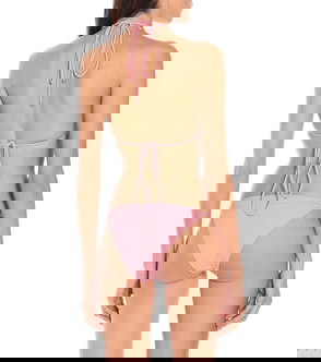 The pink gradient bikini top is a triangular, printed design crafted from breathable fabric, featuring the season's gradient artwork emulating the rich colours from the aubergine.