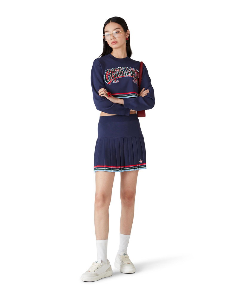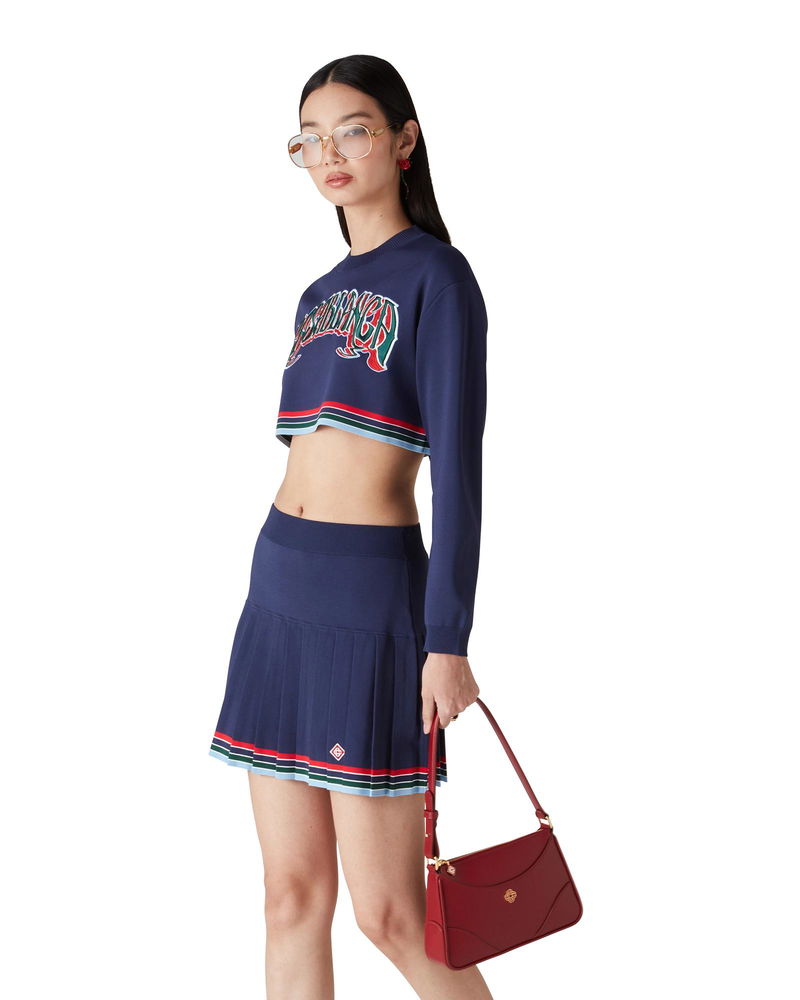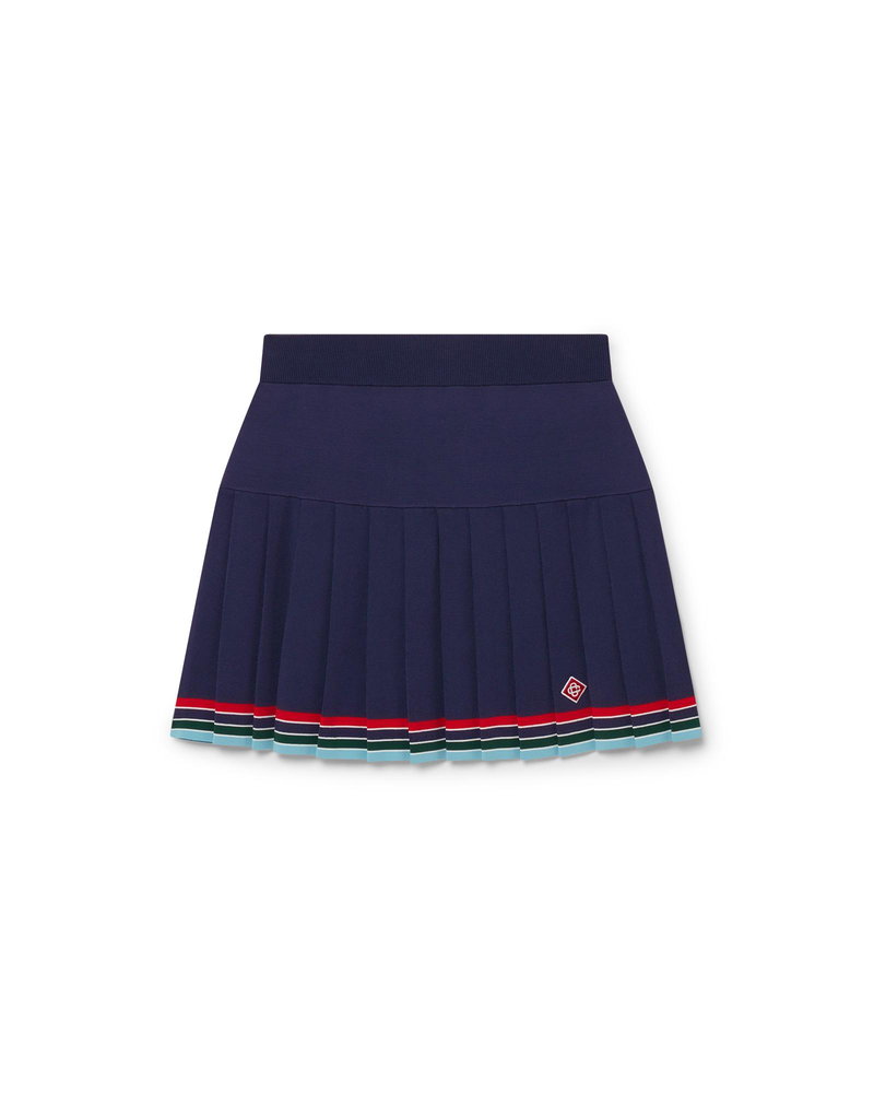 The baseball pleated skirt is a mini-style crafted from a tricot fabric.
