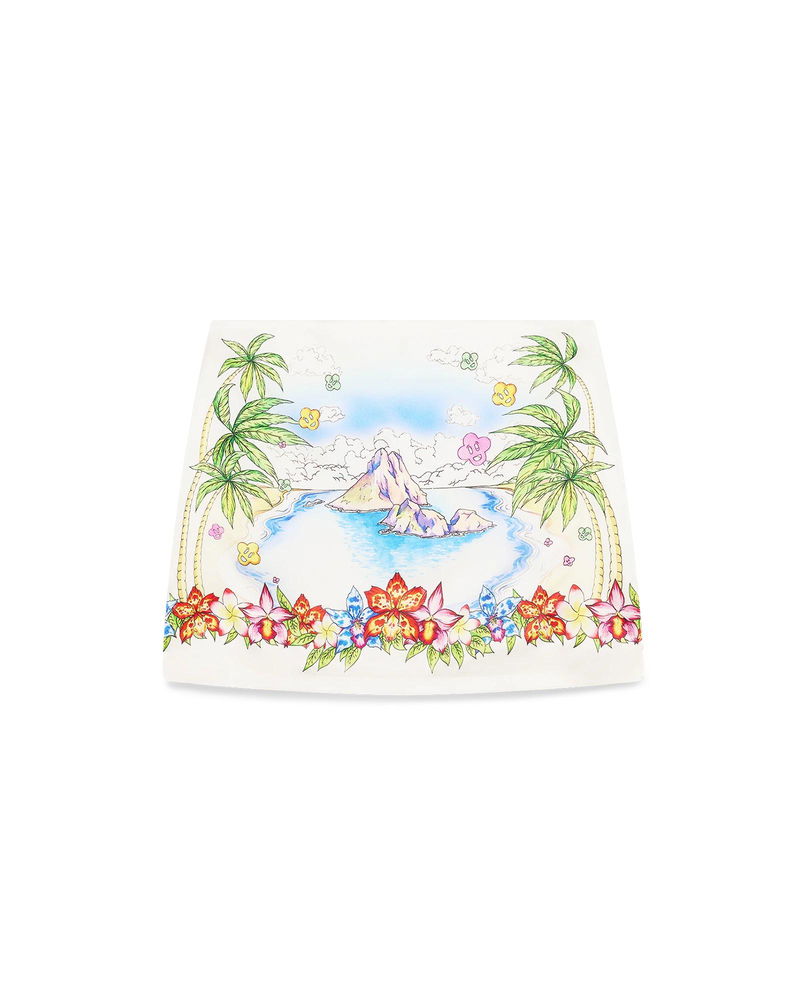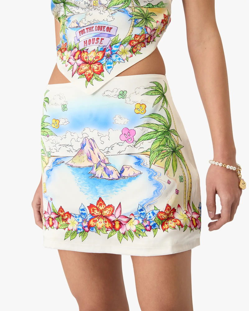 The Better Days silk satin mini skirt is a refined A-line design featuring the season's Better Days artwork that describes the utopic vision of Ibiza as a destination for an almost religious pilgrimage of discovery through it's diverse musical landscape.