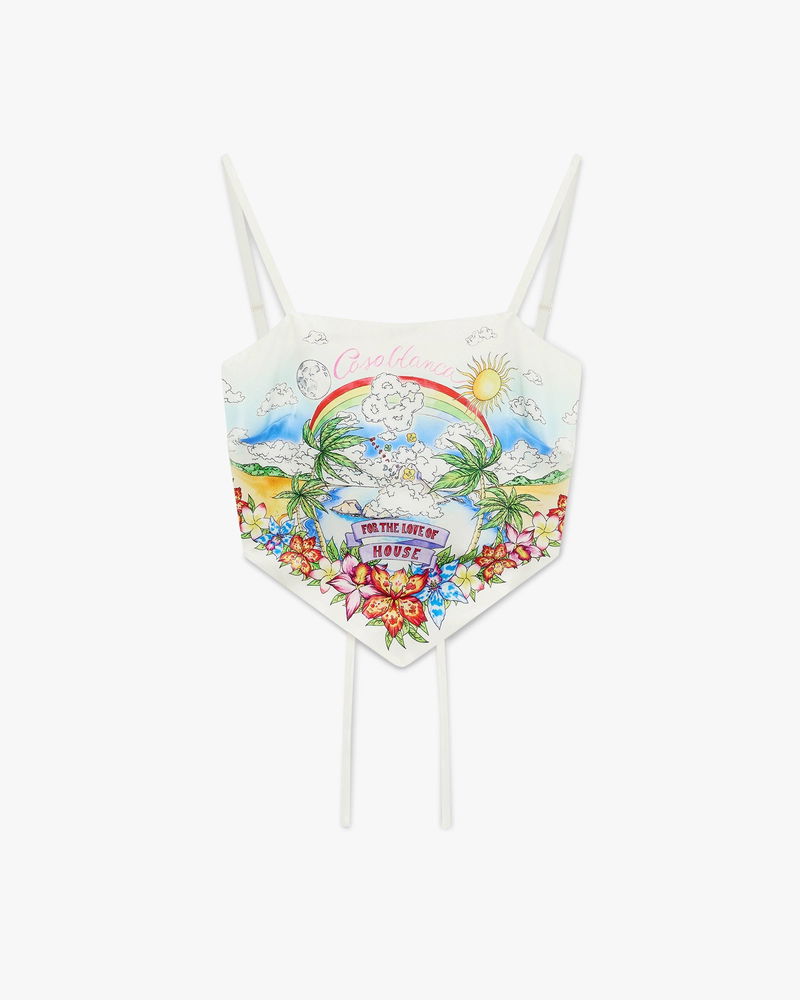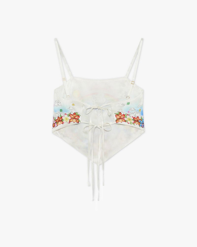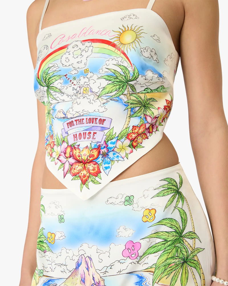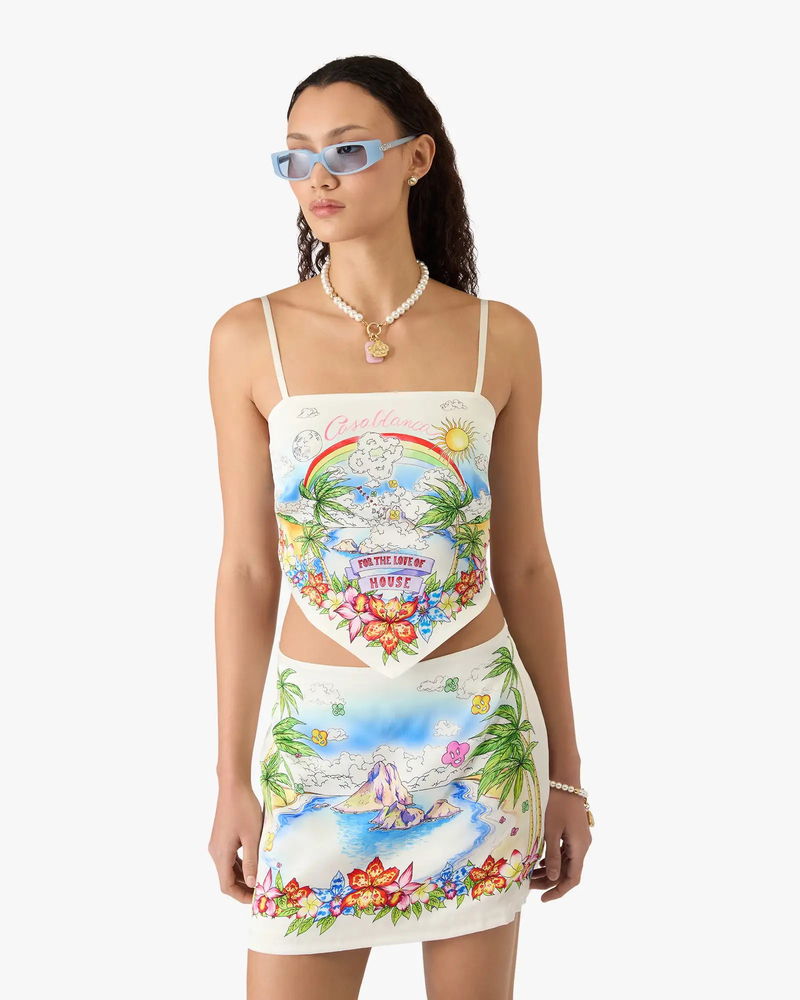 The Better Days silk satin scarf top is a refined design featuring the season's Better Days artwork that describes the utopic vision of Ibiza as a destination for an almost religious pilgrimage of discovery through it's diverse musical landscape. Completed with spaghetti straps, back tie fastening, and a slim silhouette. Designed to be worn with the coordinating mini skirt.