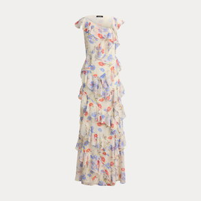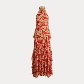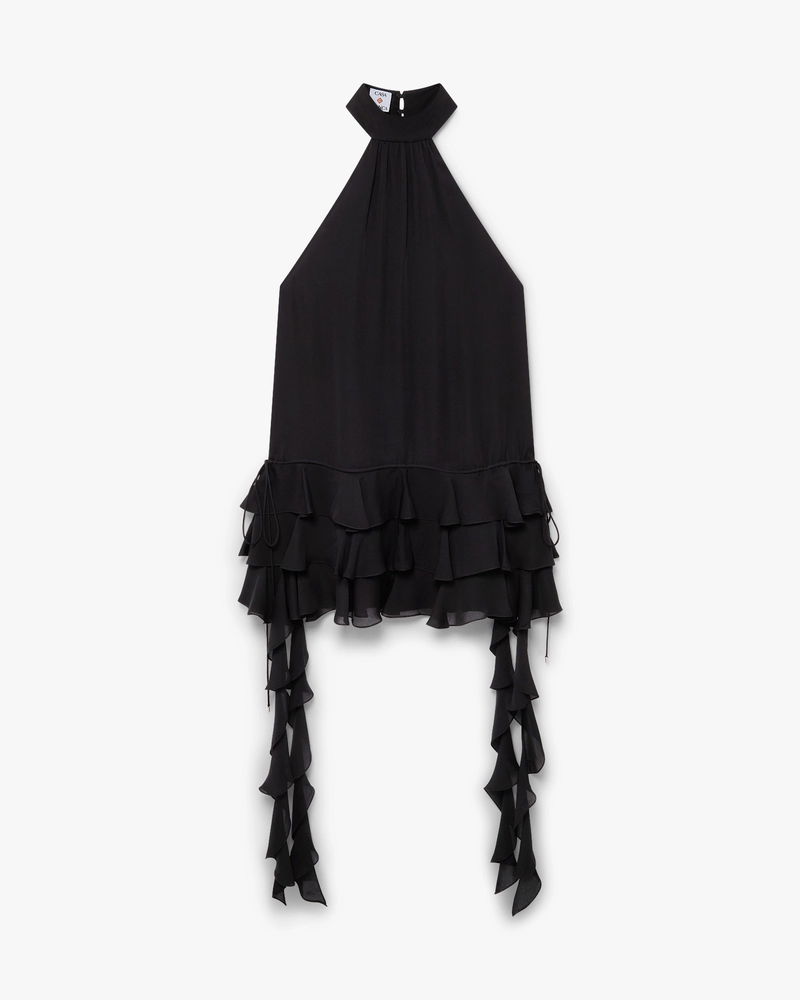 Completed with a halter neck, the house's silver-plated warped logo on the chest, a low back and elegant ruffle detailing for a feminine silhouette.