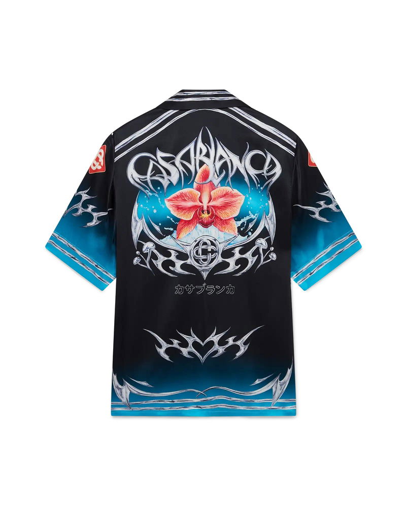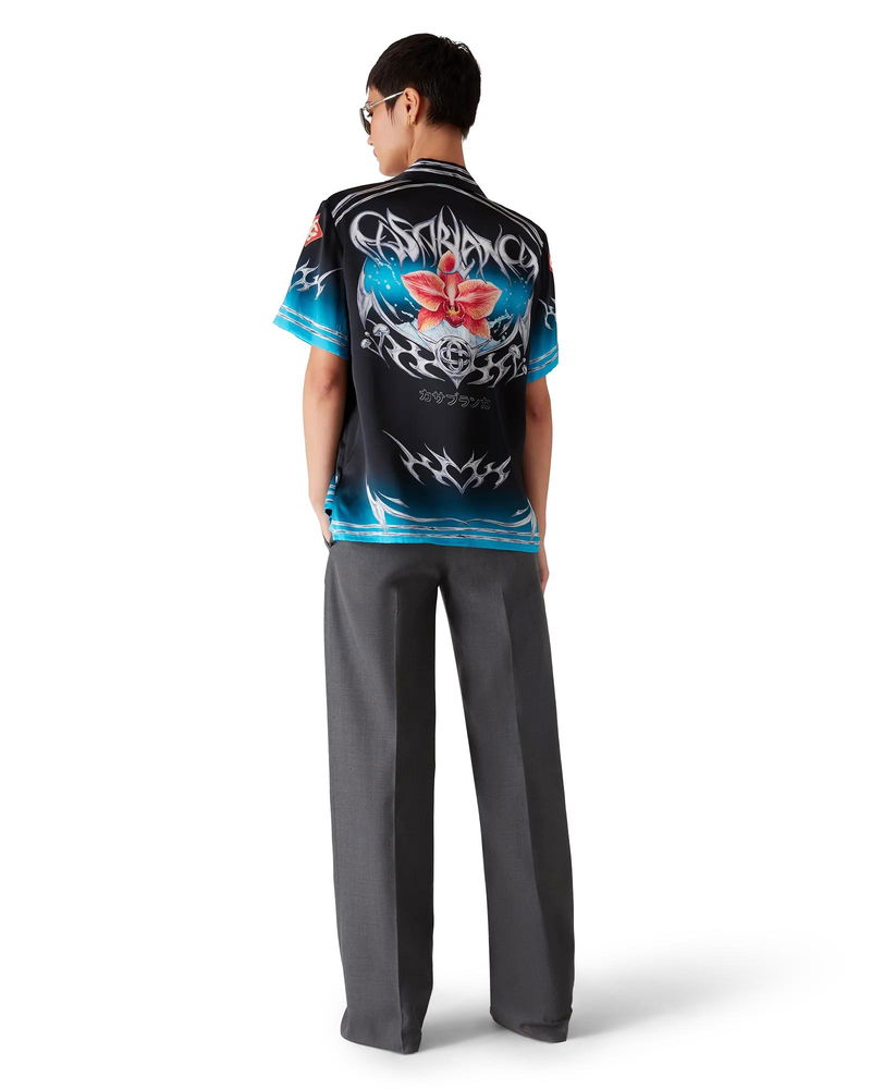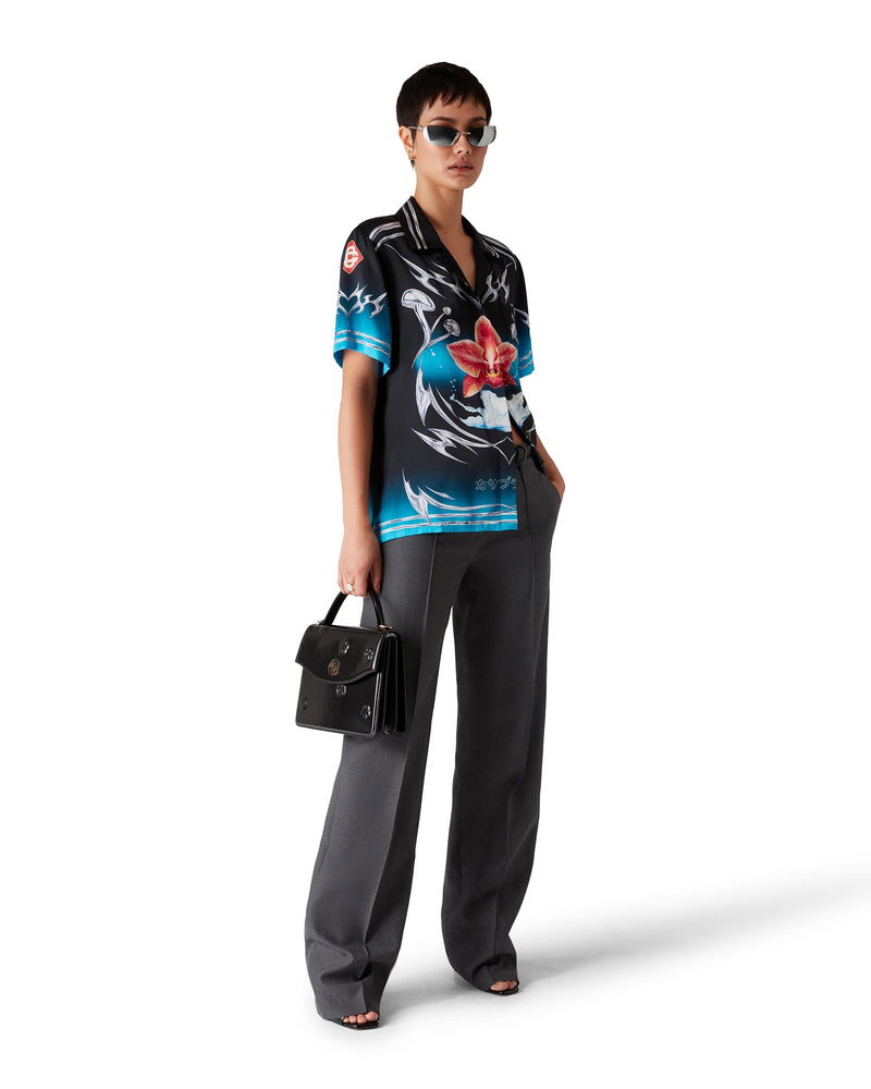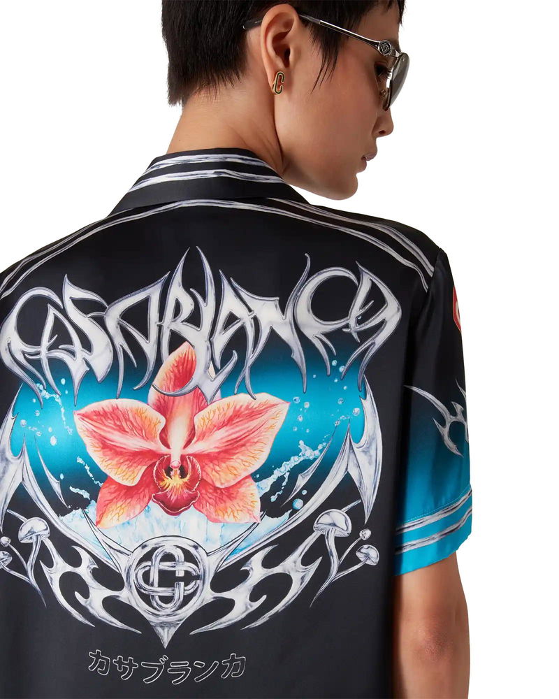 The Blades silk satin short sleeve shirt is a printed design featuring artwork that play with the contrast between two opposing feelings - the sharpness of the blade and the cold, silver chrome, contrasted with the warmth of nature, like the bold pink and red tones of an orchid flower. The addition of water brings a fresh, crisp element to the design. Completed with a Cuban collar, a breast pocket, a button closure, and signature interlocking CC corozo buttons.