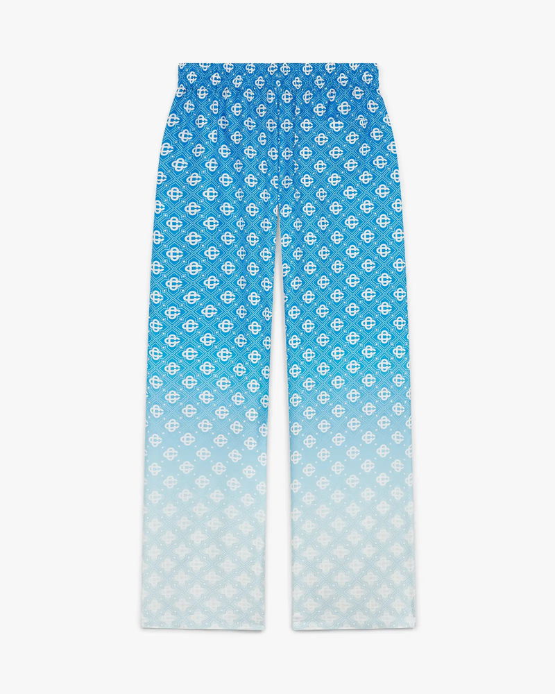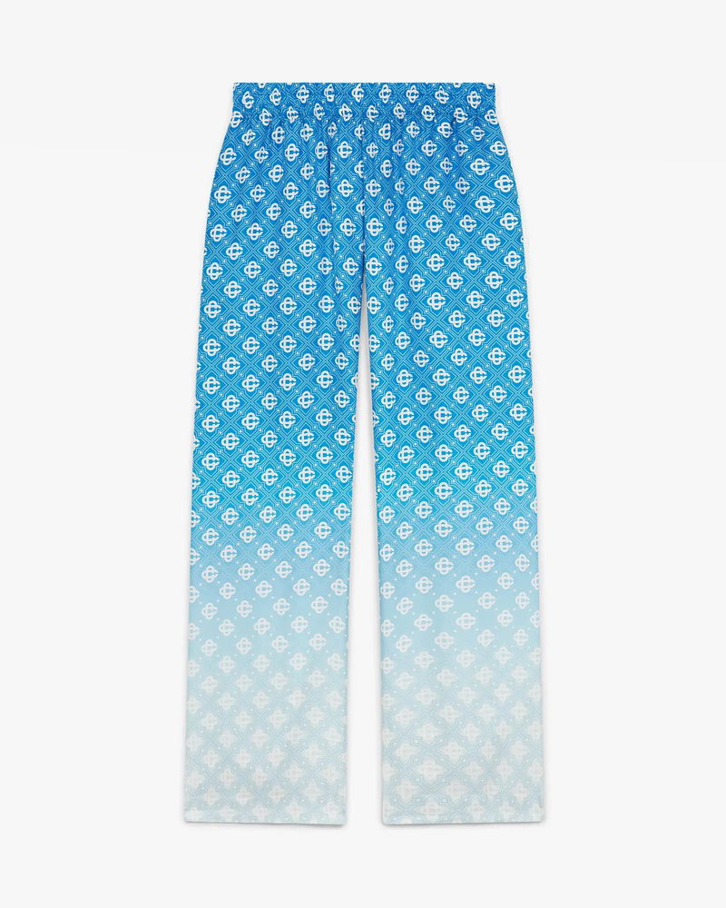 The blue gradient diamond monogram silk trousers are a straight-leg, all-over printed design featuring the season's Art of the Silks gradient diamond monogram artwork. Completed with an elasticised waistband, drawstring fastening, in-seam side pockets, and a relaxed silhouette.