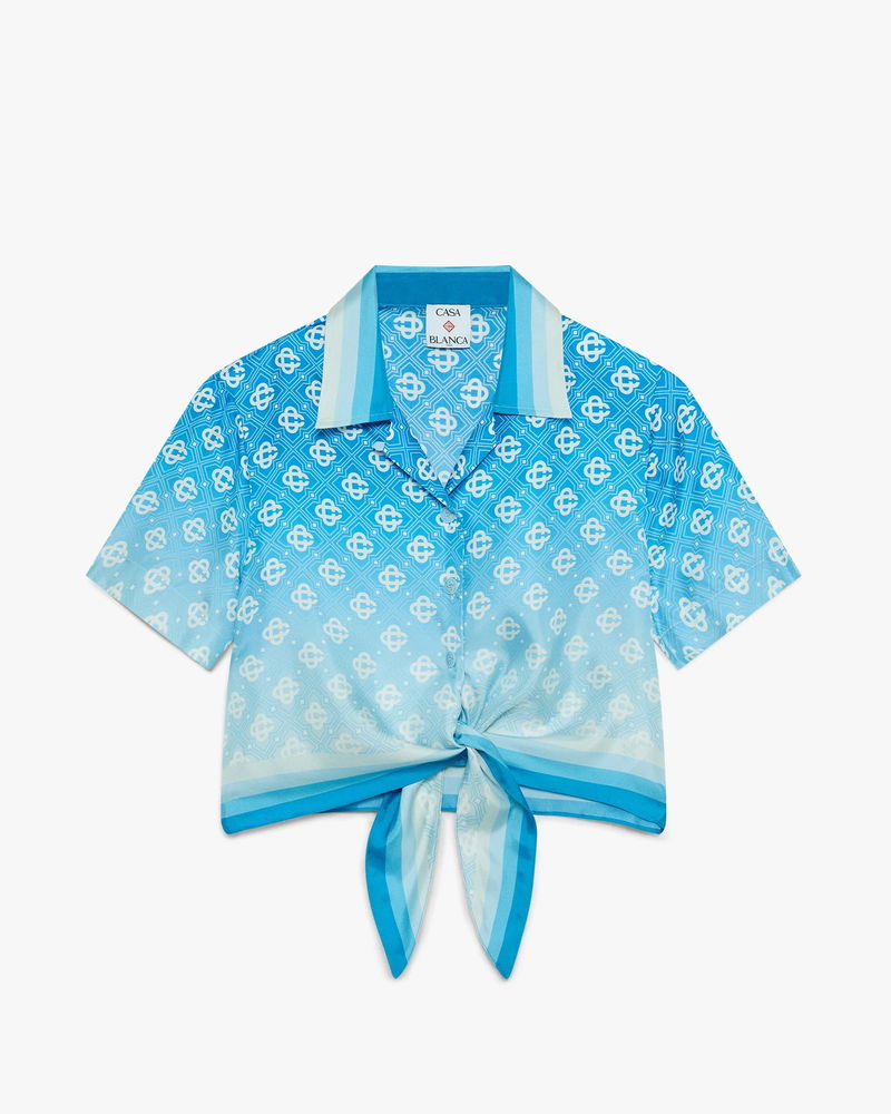 The blue gradient monogram knotted cropped silk shirt is an all-over printed design featuring the season's Art of the Silks gradient diamond monogram artwork.
