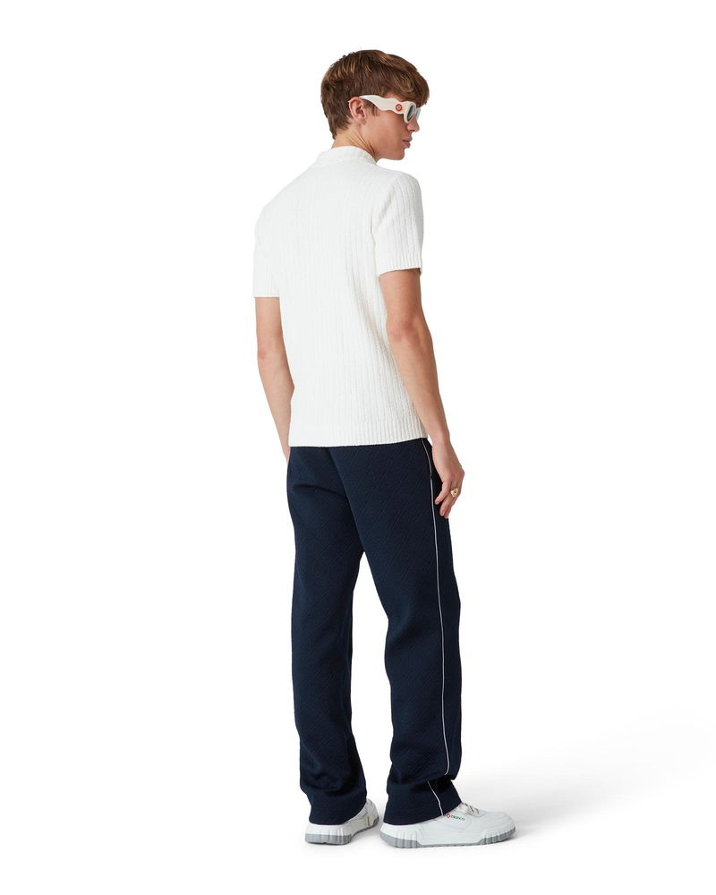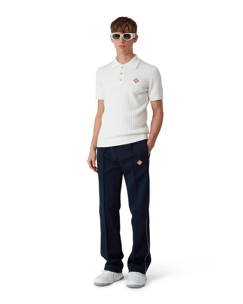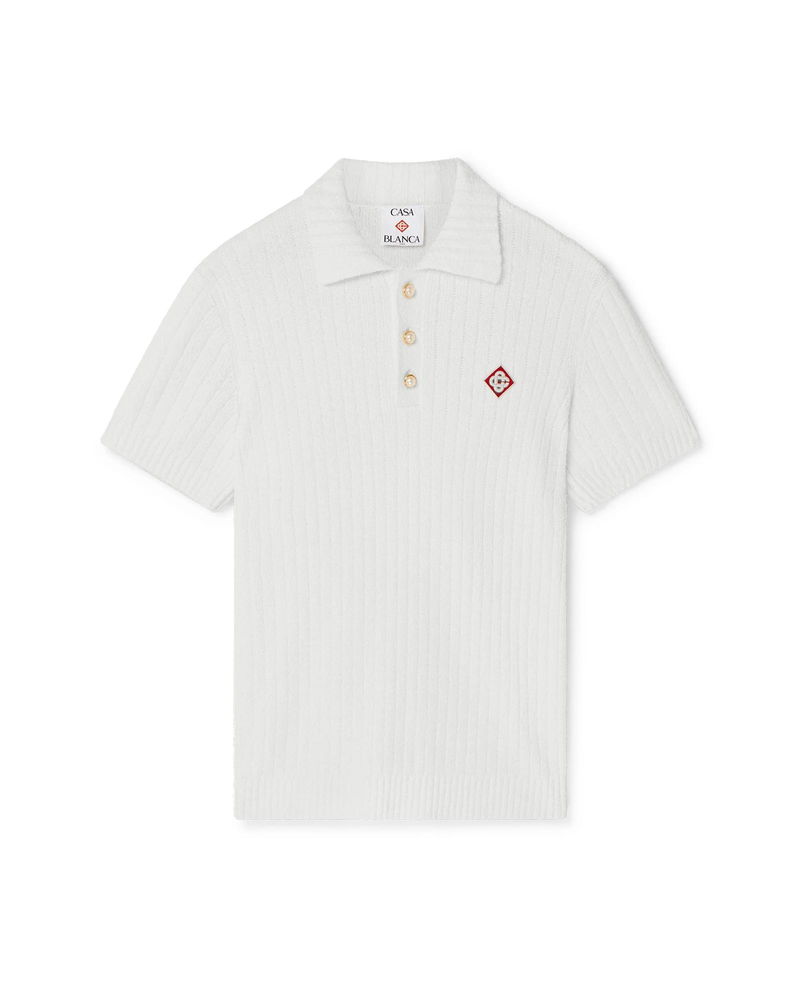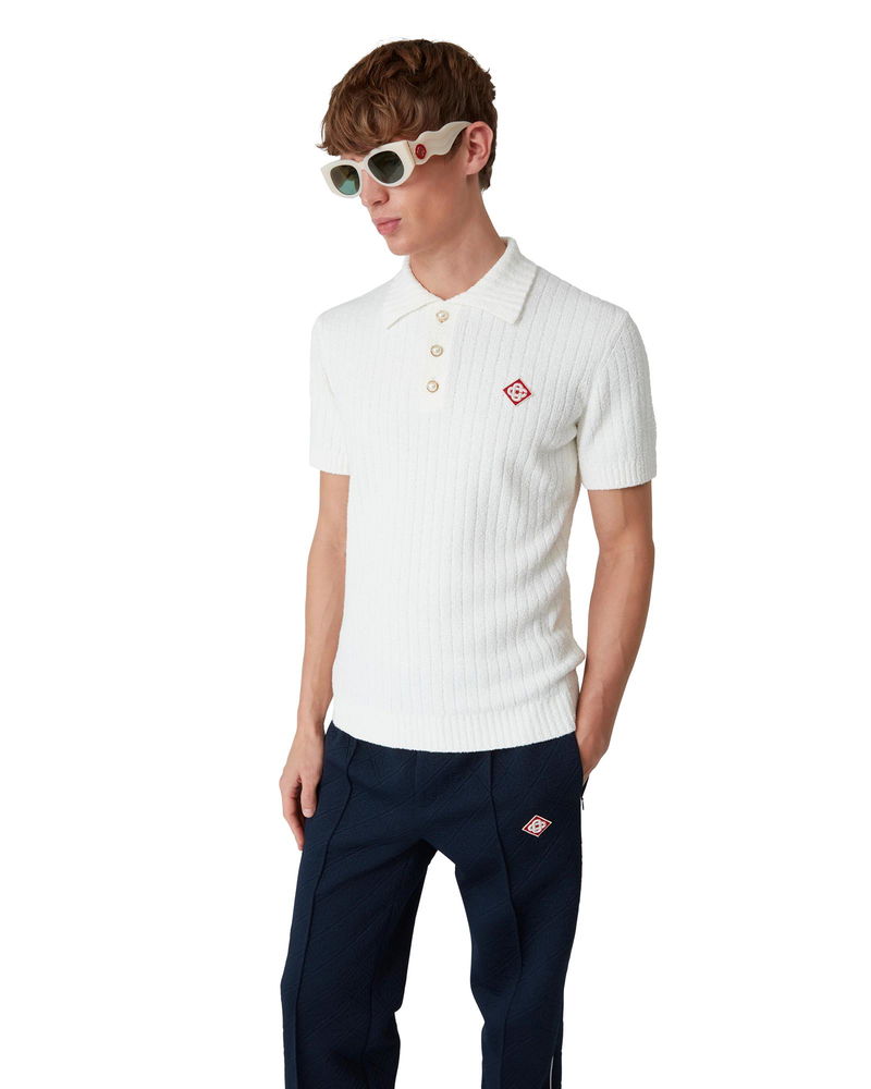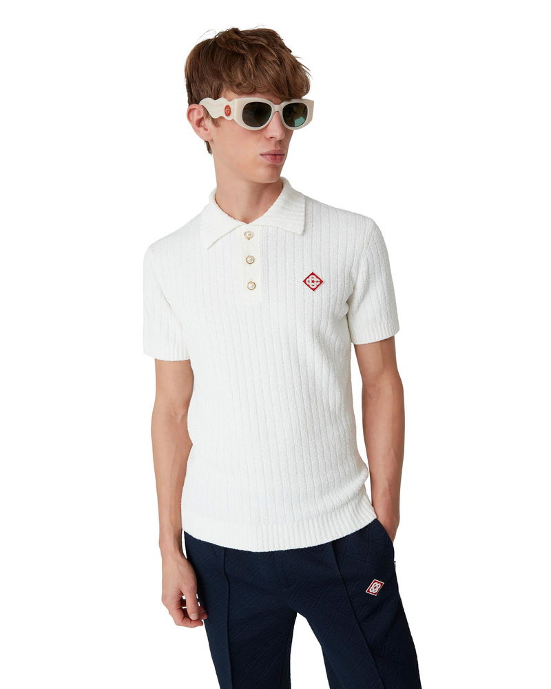 The boucle polo shirt is a soft textured design crafted from a cotton blend fabric with subtle rib detail and features the house's signature diamond logo. Completed with a ribbed collar, cuffs, hem, and signature gold rim pearl buttons. Cotton boucle fabric Main: 63% cotton 25% polyamide 11% polyester 1% elastane Colour: white Specialised dry clean only Model is 185cm/6'1 and is wearing a size M Made in China Boucle Polo Shirt, Size XL by Casablanca Paris