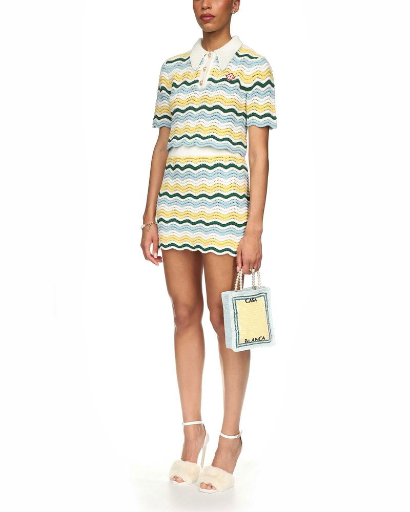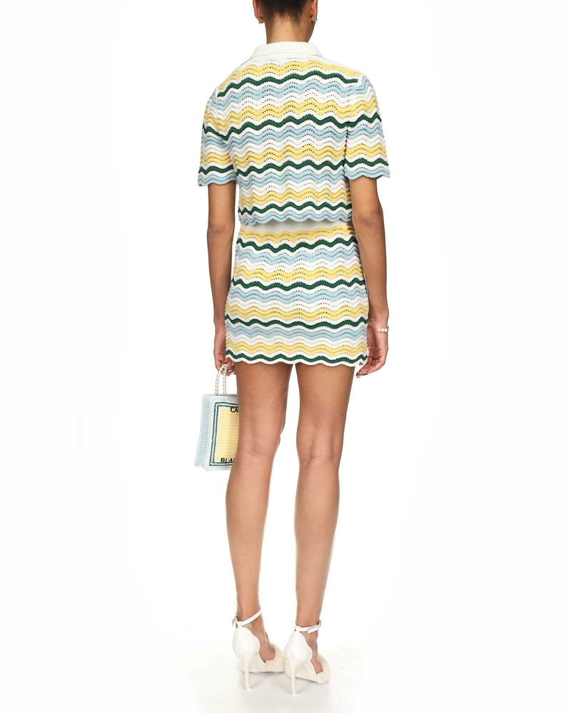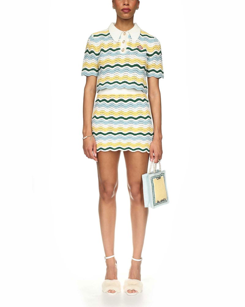 The boucle wave top is a short-sleeved signature Casablanca style crafted from a soft textured open-weave crochet fabric and features a white rib collar and placket.