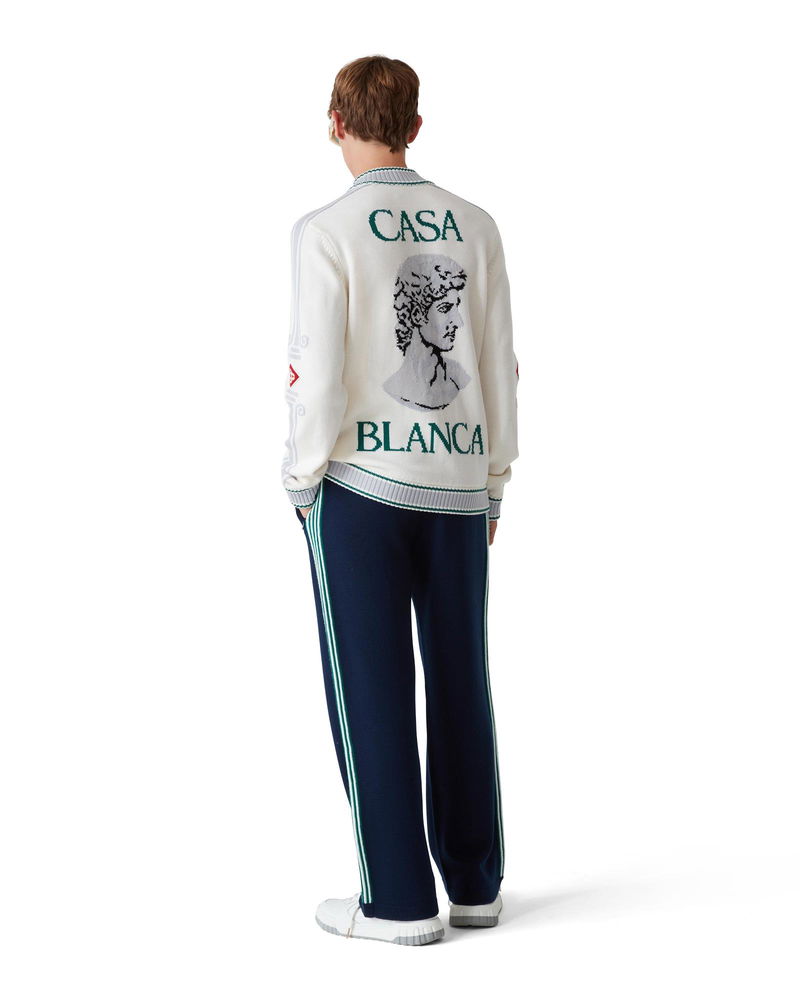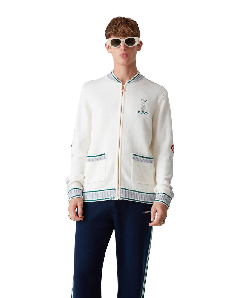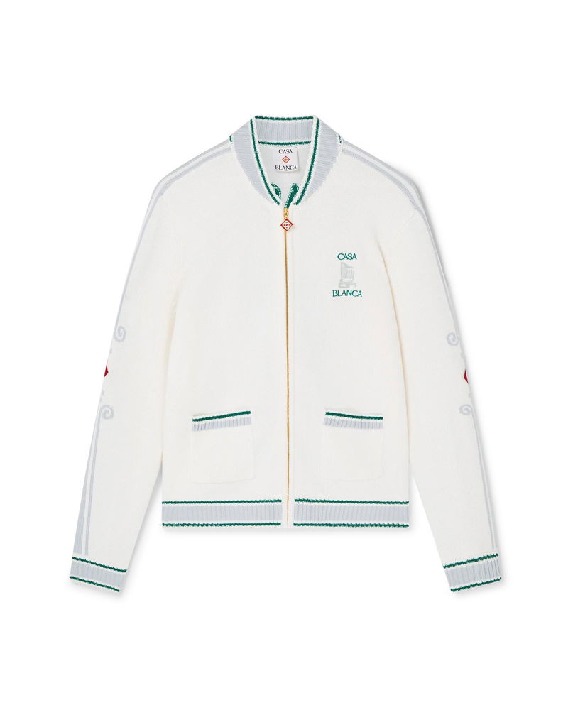 The Casa Club jacket is a classic long-sleeve design crafted from merino wool fabric featuring seasonal artwork inspired by the continued study of the classical beauty and contemporary allure of Ancient Greece. Completed with front zip closure, column detail down the sleeves, front patch pockets, rib collar, cuffs, and hem. Merino wool fabric 100% merino wool Colour: white Specialised dry clean only Model is 185cm/6'1 and is wearing a size M Made in China Casa Club Jacket, Size Small by Casablanca Paris