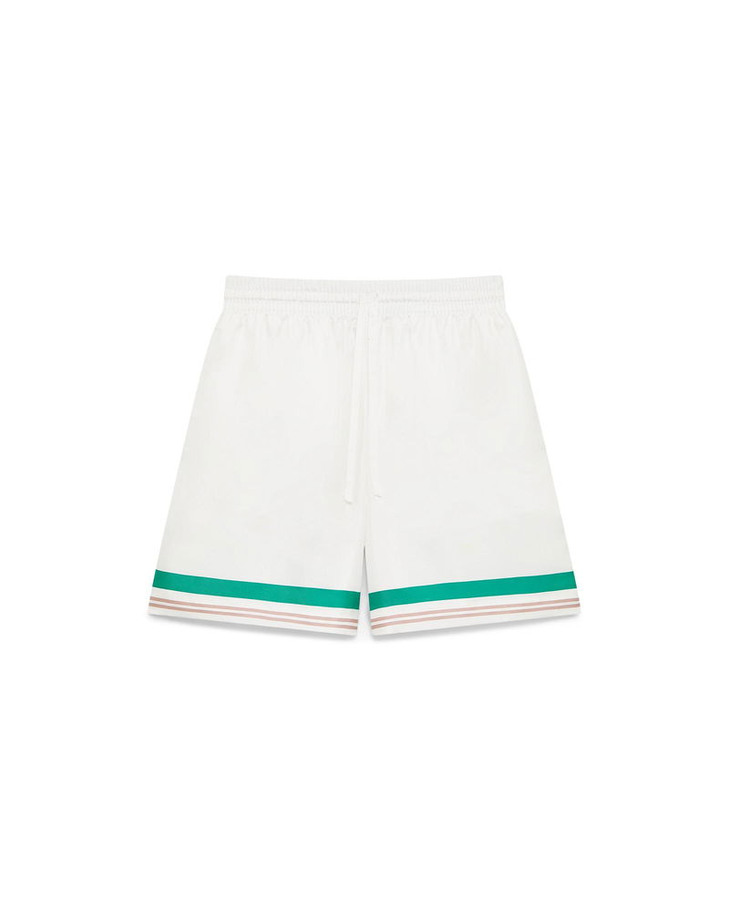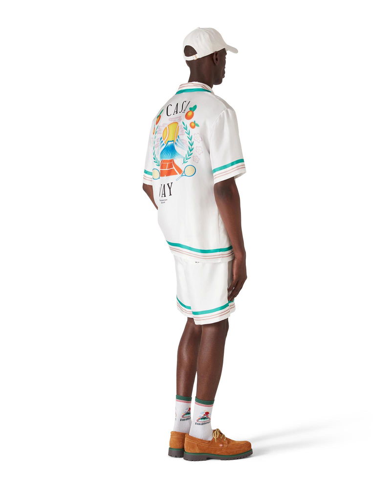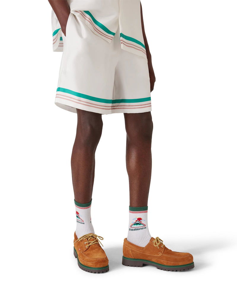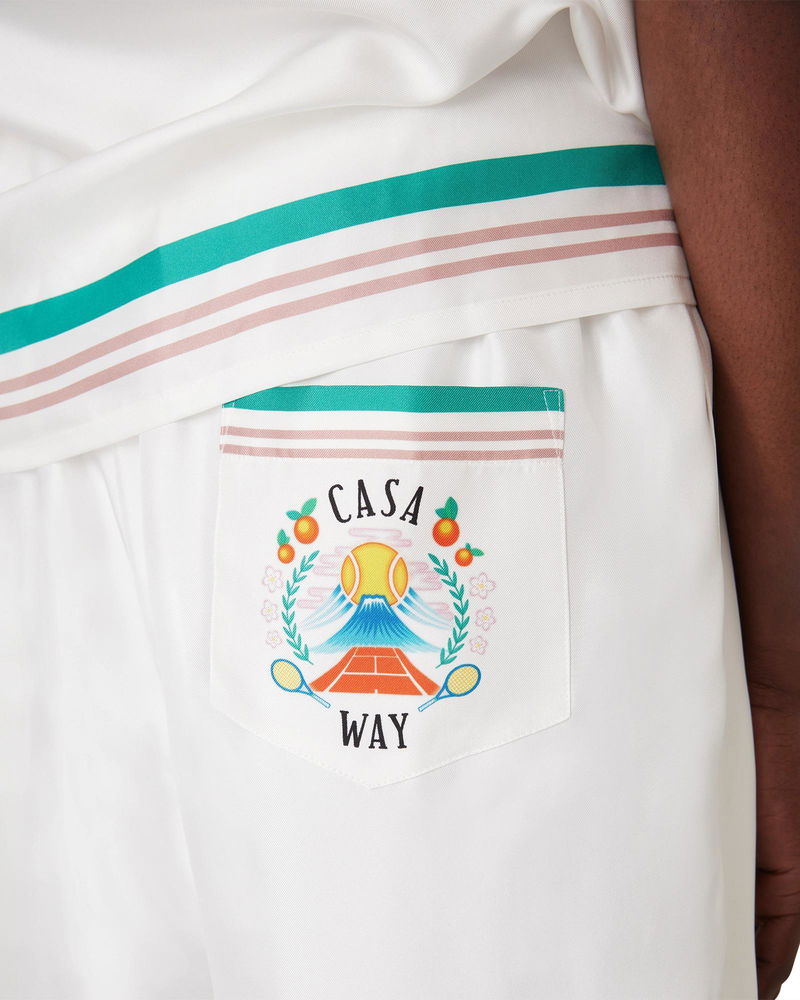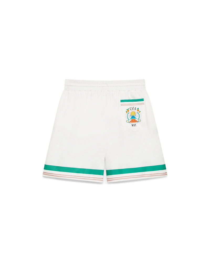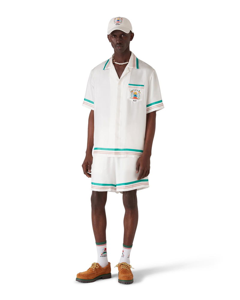The Casa Way silk shorts are a printed design crafted from silk twill fabric. Completed with an elasticised waistband, drawstring fastening, in-seam side pockets, a back pocket, and striped hem and pocket detail. Printed silk twill fabric 100% silk Casa Way print multicolour Specialised dry clean only Made in Italy Relaxed fit The model is 187cm/6'1 and is wearing a size M Casa Way Silk Shorts, Size Small by Casablanca Paris