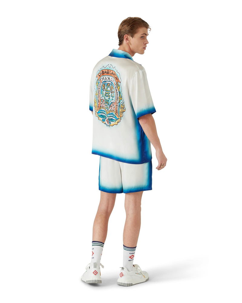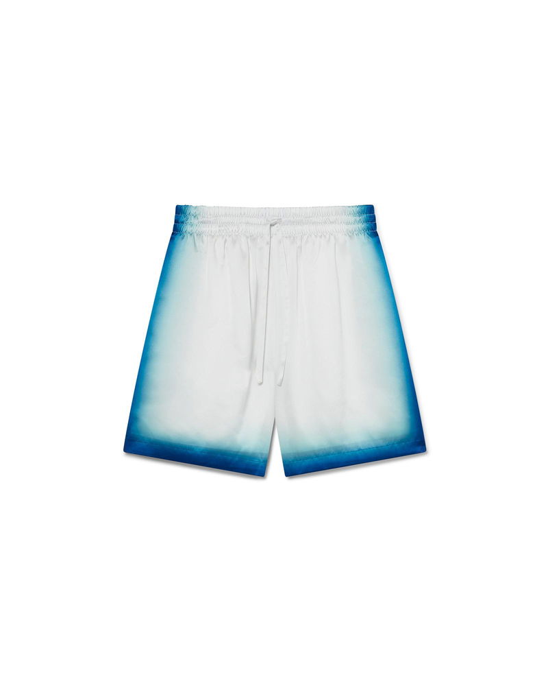 The Casa Way Skate silk shorts are a classic design crafted from silk satin fabric featuring the season's Casa Way Skate artwork, inspired by classic 70s California skate insignia with a fade-out frame. Completed with an elasticated waistband, drawstring fastening, in-seam side pockets, and a back patch pocket. Faded silk satin fabric Main: 100% silk Lining: 100% polyester Colour: blue fade Specialised dry clean only Made in Italy The model is 185cm/6'1 and is wearing a size M Casa Way Skate Silk Shorts in Blue, Size XS by Casablanca Paris