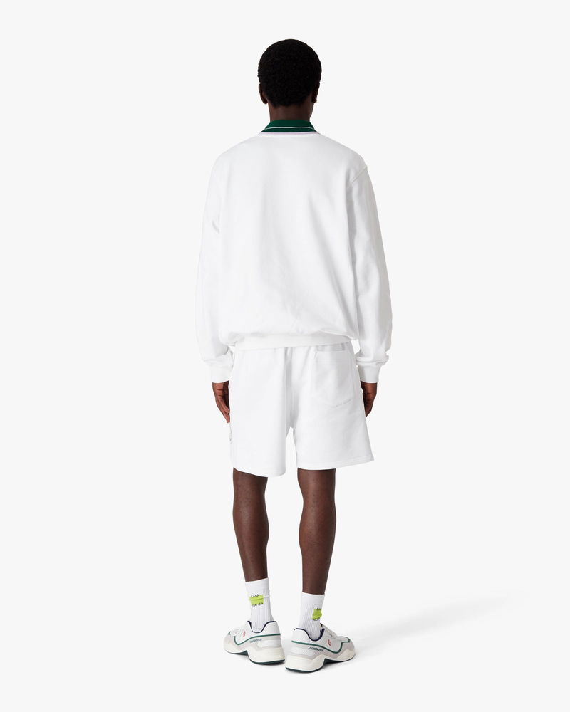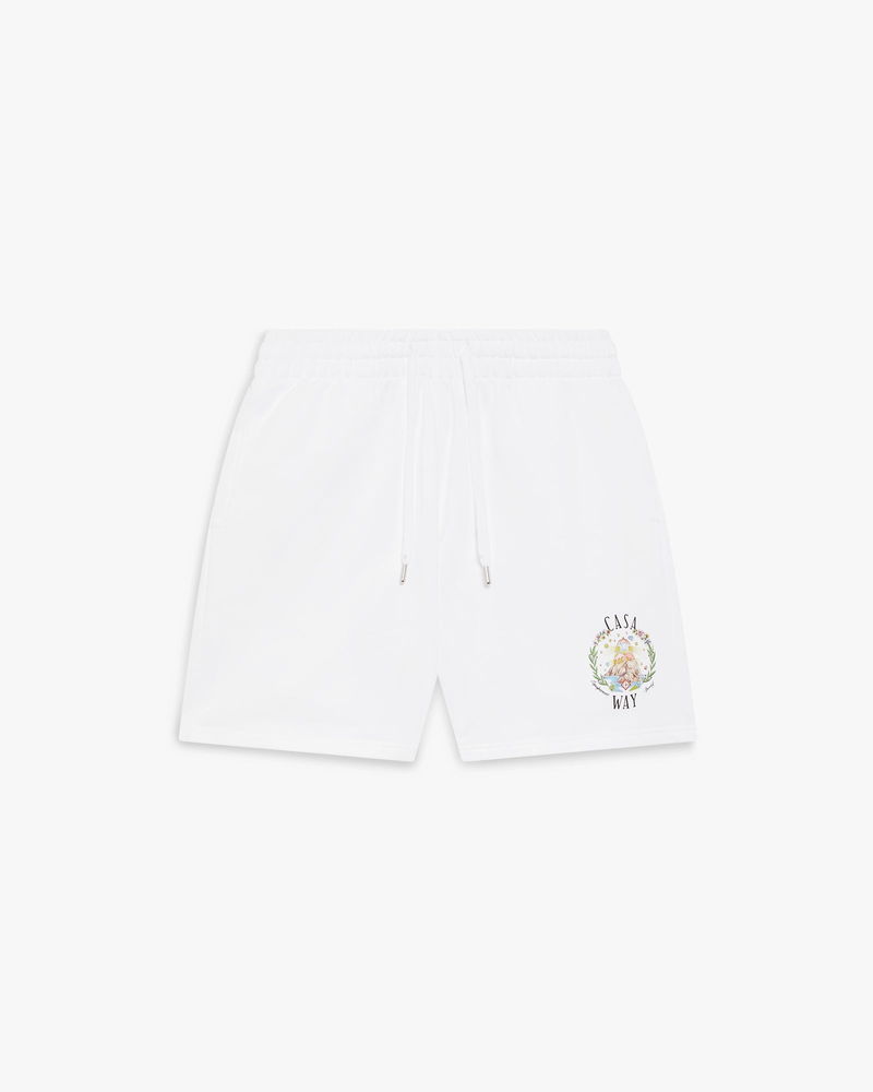 The Casa Way sweatshorts are a refined design crafted from organic cotton loopback fabric, featuring artwork that describes the utopic vision of Ibiza as a destination for an almost religious pilgrimage of discovery through its diverse musical landscape and as a meeting point and place of profound experience. Completed with an elasticised waistband, drawstring fastening, in-seam side pockets, and a back patch pocket. Cotton loopback fabric 100% organic cotton Lining: 100% organic cotton Colour: white Delicate machine wash Made in Portugal The model is 185cm / 6'1 and is wearing size M Relaxed fit Casa Way Sweatshorts, Size XS by Casablanca Paris