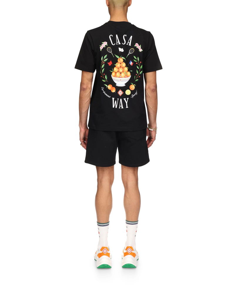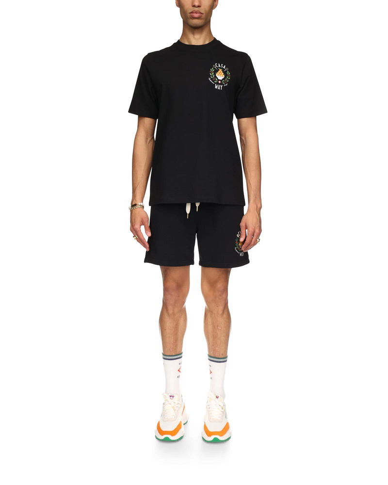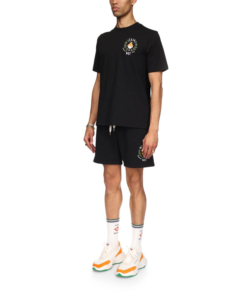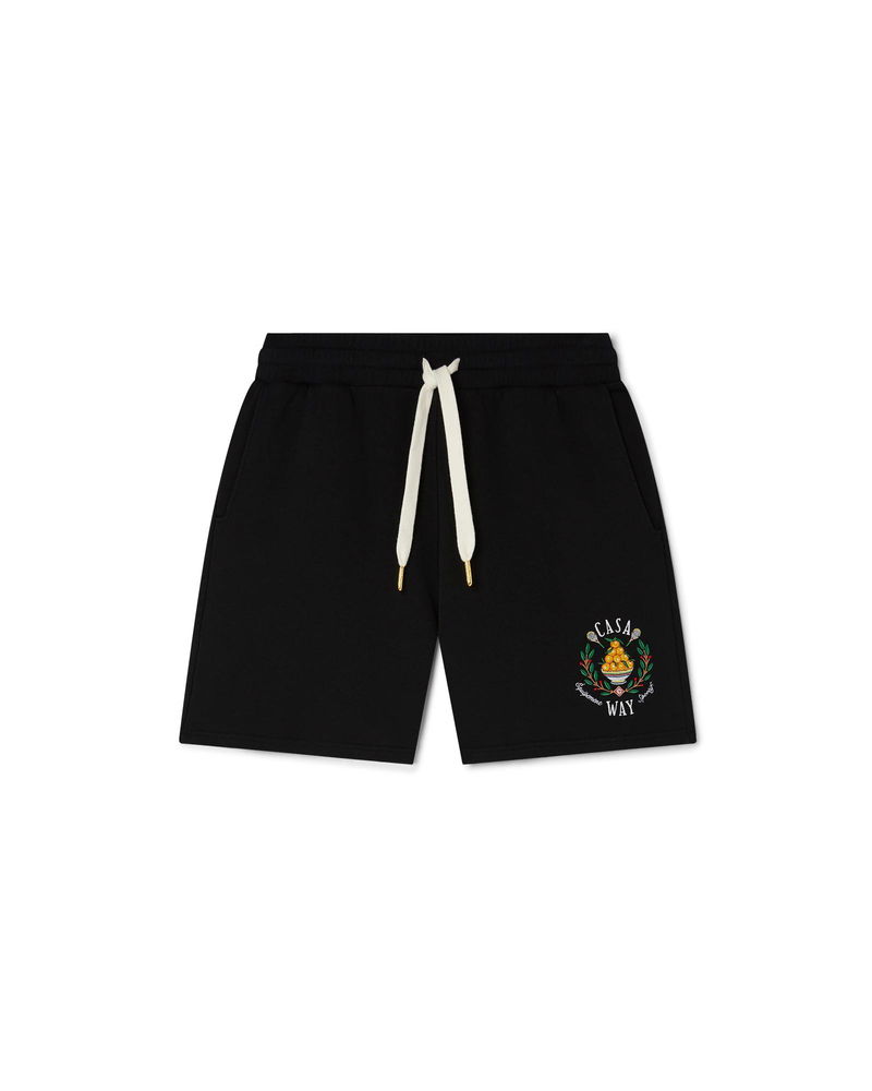 The Casa Way sweatshorts is an organic cotton design and features the house's signature artwork with embroidered illustrations of sporting equipment and floral details reinterpreted for the season. Completed with gold-tipped drawstring fastening, slanted side pockets, and a back pocket. Cotton fabric 100% cotton Embroidery: 100% viscose Colour: black Delicate machine wash Made in Portugal Casa Way Sweatshorts, Size Medium by Casablanca Paris