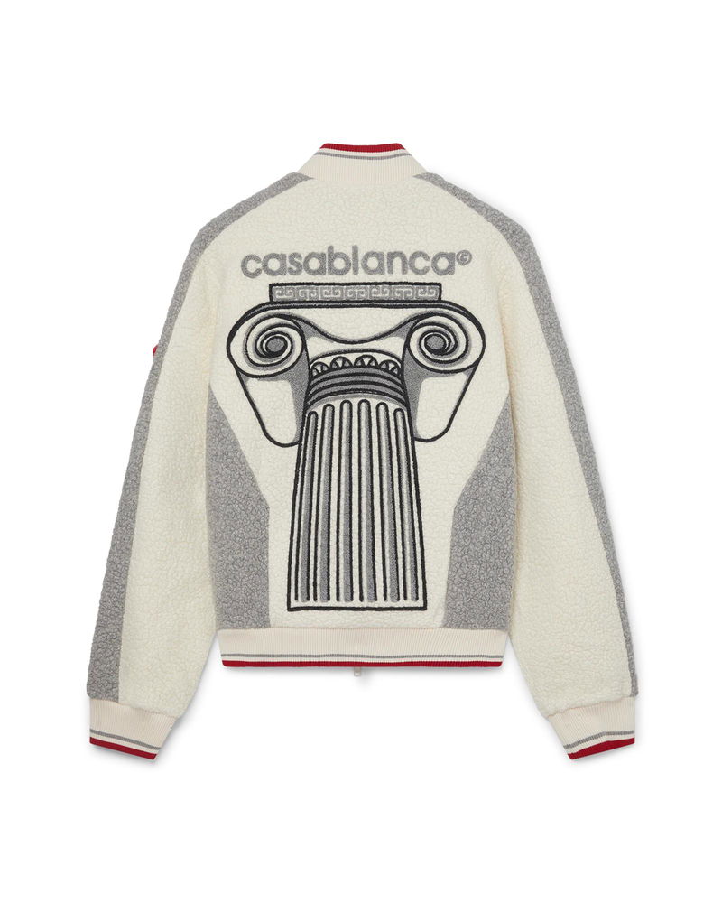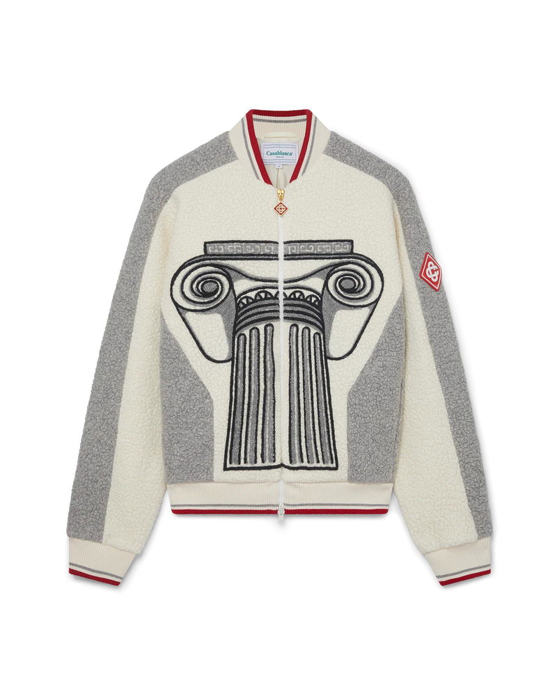 The cashmere column jacket is a long-sleeved collegiate-influenced varsity design displaying the season's Greek-inspired column. Crafted from a cashmere terry wool blend fabric and completed with a zip closure, rib standing collar, cuffs and hem with striped edge details and lining. Cashmere terry fabric 39% wool 22% viscose 17% polyamide 14% polyester 8% cashmere Lining: 54% viscose 43% nylon 3% elastane Specialised dry clean only Fit true to size, take your regular size Cashmere Column Jacket, Size Medium by Casablanca Paris
