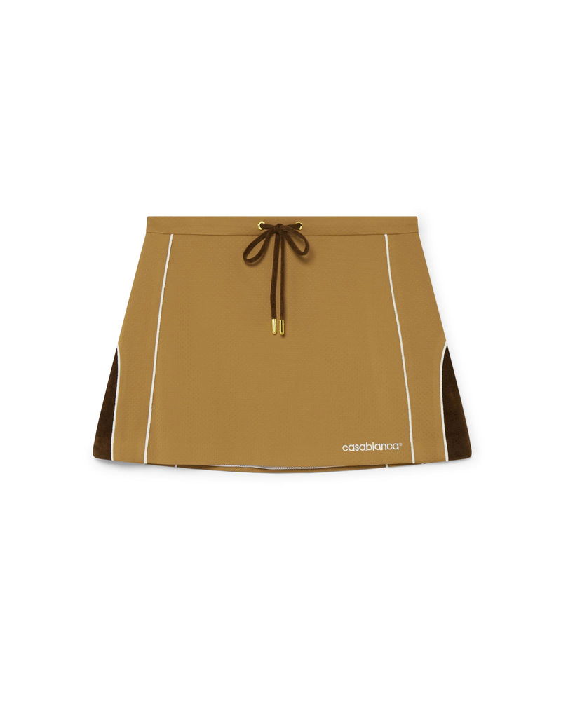 The Chenille panelled mini skirt is a sportswear-inspired design crafted from velour technical fabric and features the house's Casablanca logo. Completed with an elasticated waistband, gold-tipped drawstring fastening, and side panels with white piping details. Velour technical fabric.