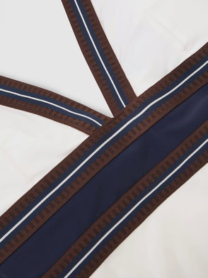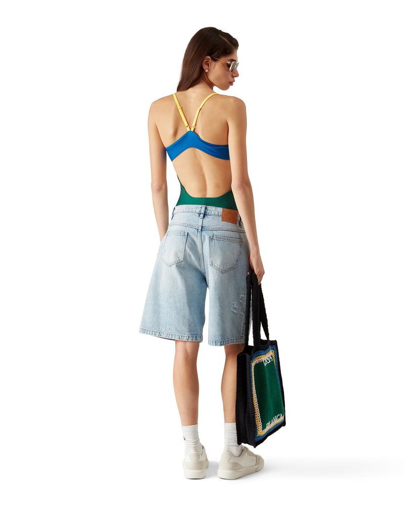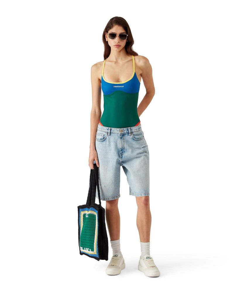 The colourblock swimsuit is crafted from a breathable technical swim fabric, featuring the house's Casablanca logo on the chest. Completed with contrast trims, high-cut legs, a scoop neck, and a cut-out back. .